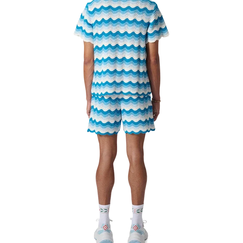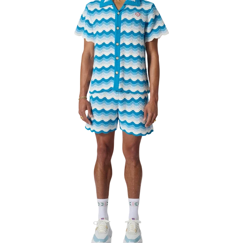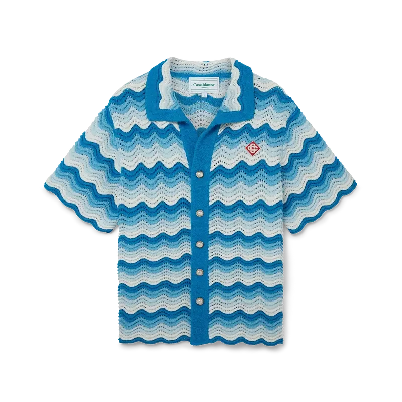 Het Wavy Gradient-overhemd is een kenmerkend Casablanca-model, vervaardigd van een zacht, open geweven haakstof in blauwtinten – de ultieme zomerse basis. Afgewerkt met onze kenmerkende gouden parelknopen, open kraag, korte mouwen en het Casablanca Paris-merklabel – ontworpen voor een klassieke pasvorm.