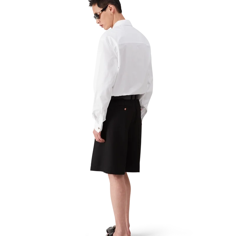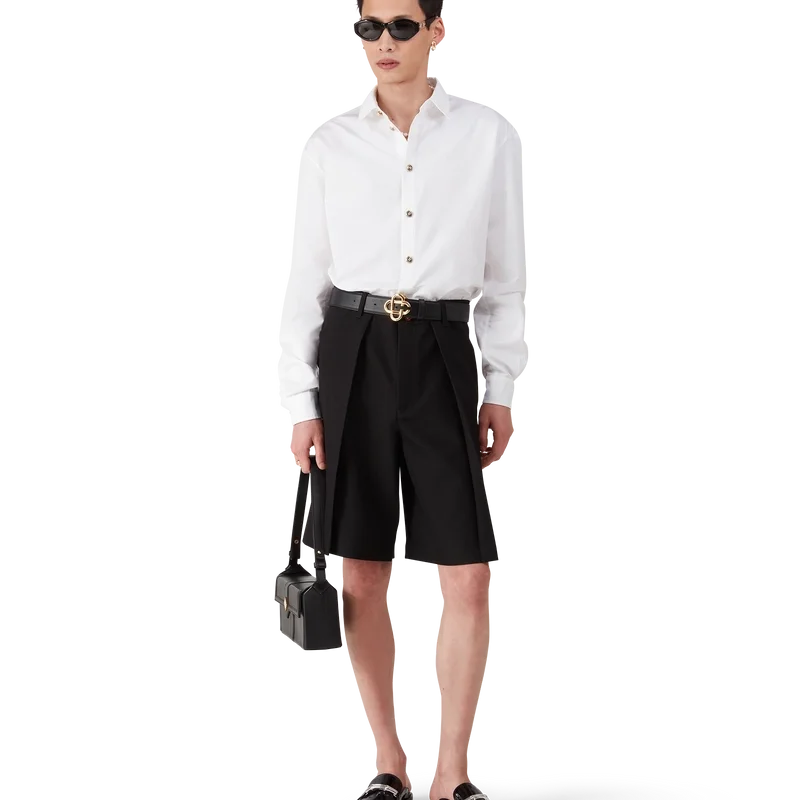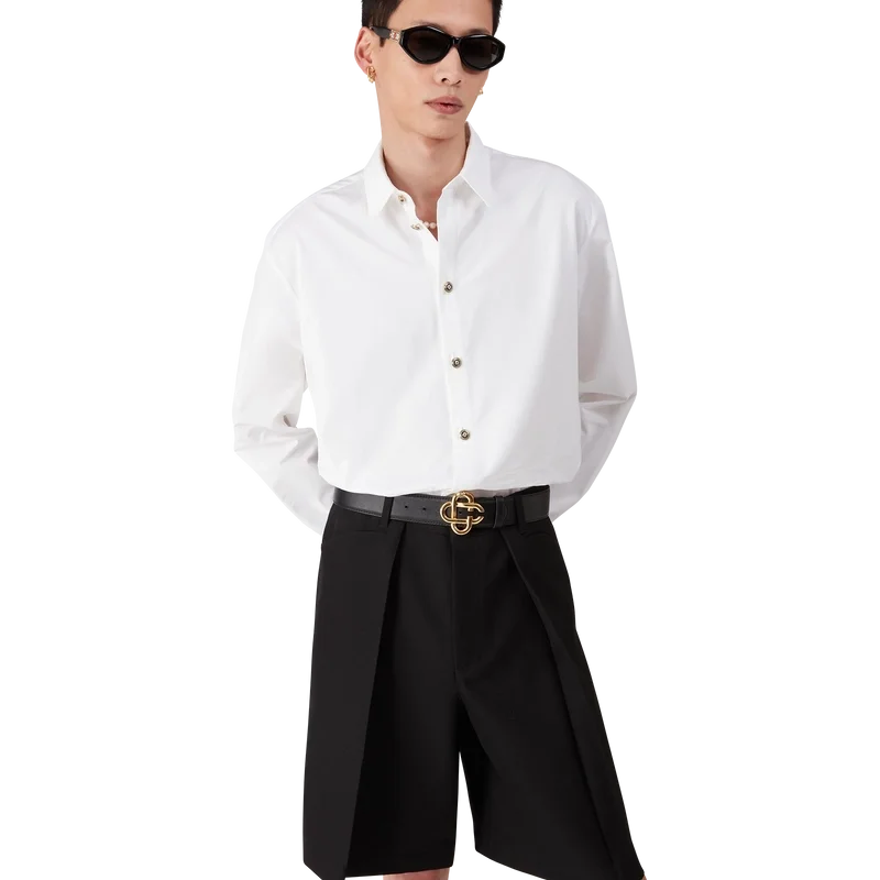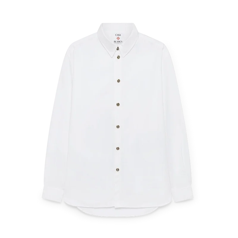 Het witte katoenen overhemd is een model met lange mouwen, vervaardigd uit katoenen overhemdstof. Afgewerkt met een puntkraag, knoopsluiting, platte emaille knopen en een afgeronde zoom.