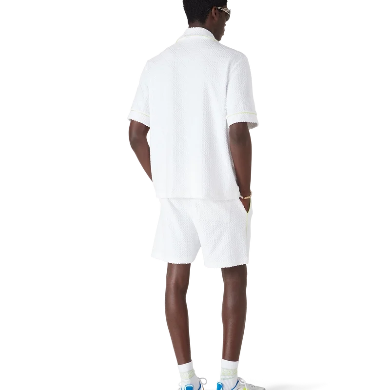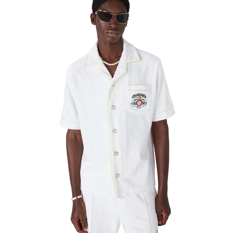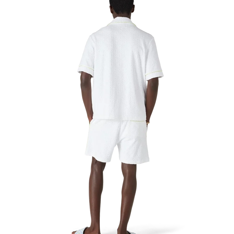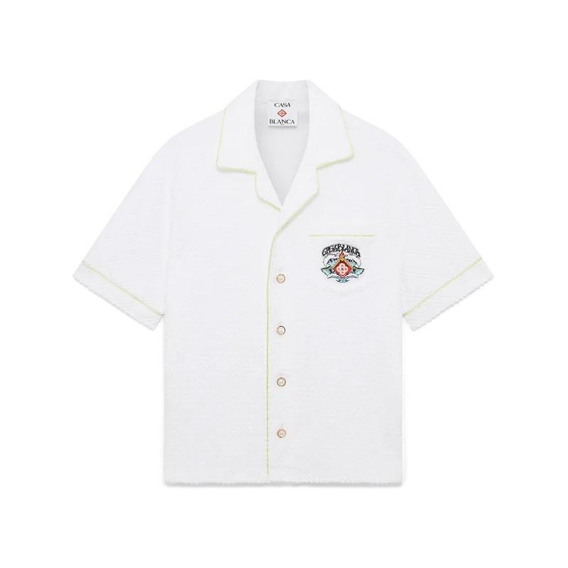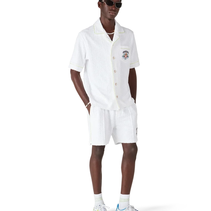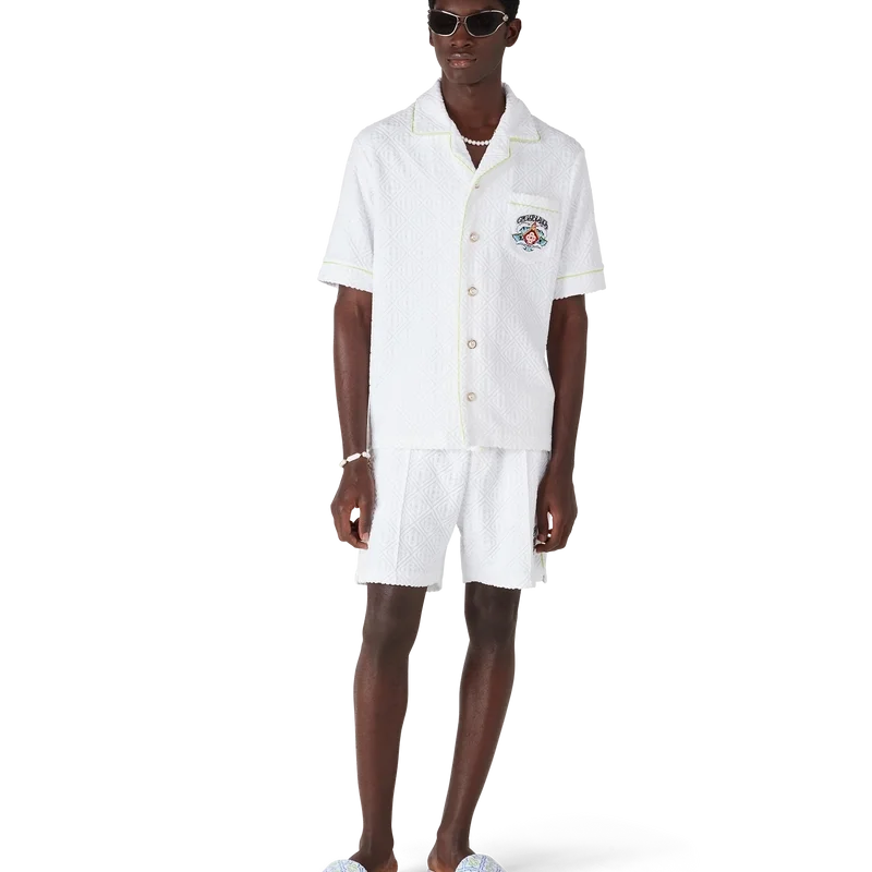 Het badstof Monogram-overhemd is een verfijnd ontwerp met korte mouwen, voorzien van de ‘Innocence’-illustratie van dit seizoen. Deze afbeelding toont een oceaanscène bij zonsondergang met een eiland in het midden, weergegeven in een stijl die is beïnvloed door klassieke surf-T-shirtkunst. Het kunstwerk legt de etherische schoonheid van het gouden uur boven tropische wateren vast en presenteert een geïdealiseerd beeld van een strandparadijs door de verfijnde sport- en vrijetijdsbril van het huis. Afgewerkt met een kraag in Cubaanse stijl, een borstzak, knoopsluiting, kenmerkende gouden parelknopen en biezen op de kraag, manchetten en knoopsluiting.