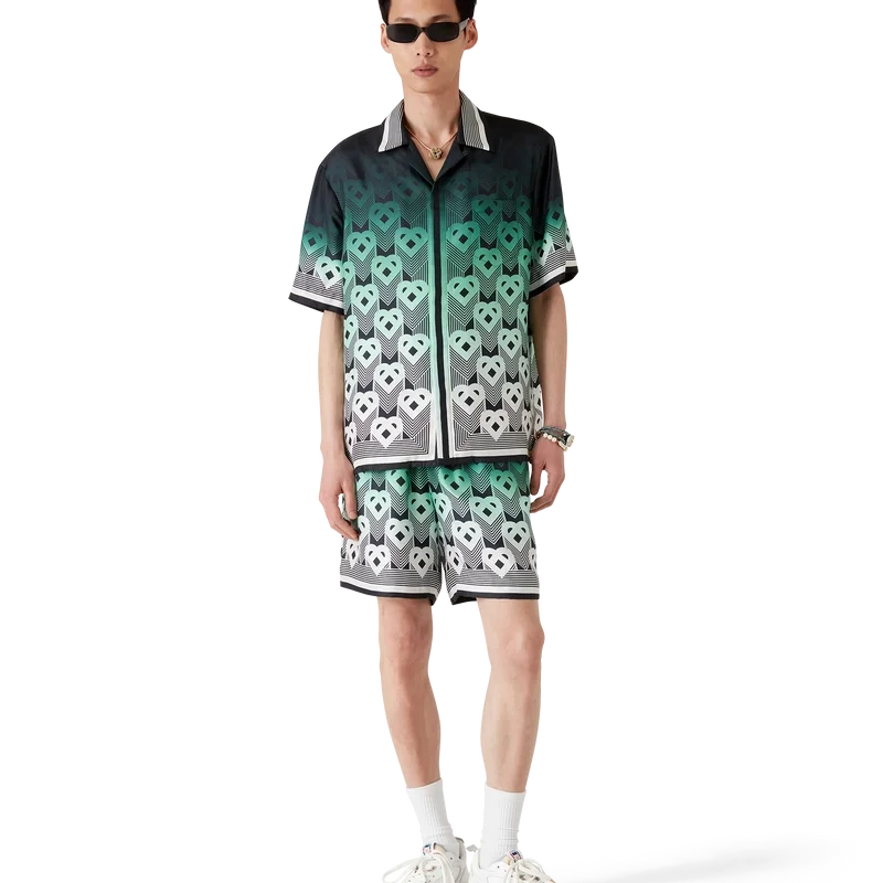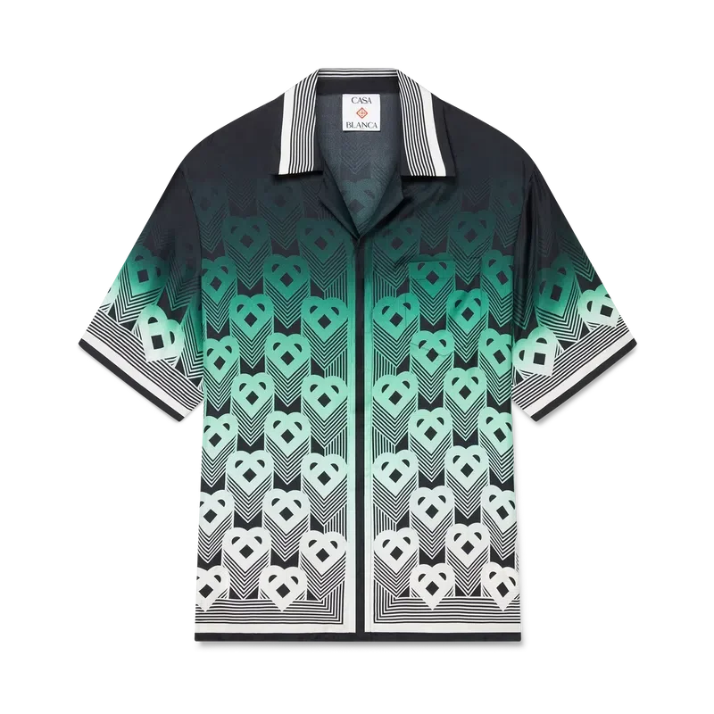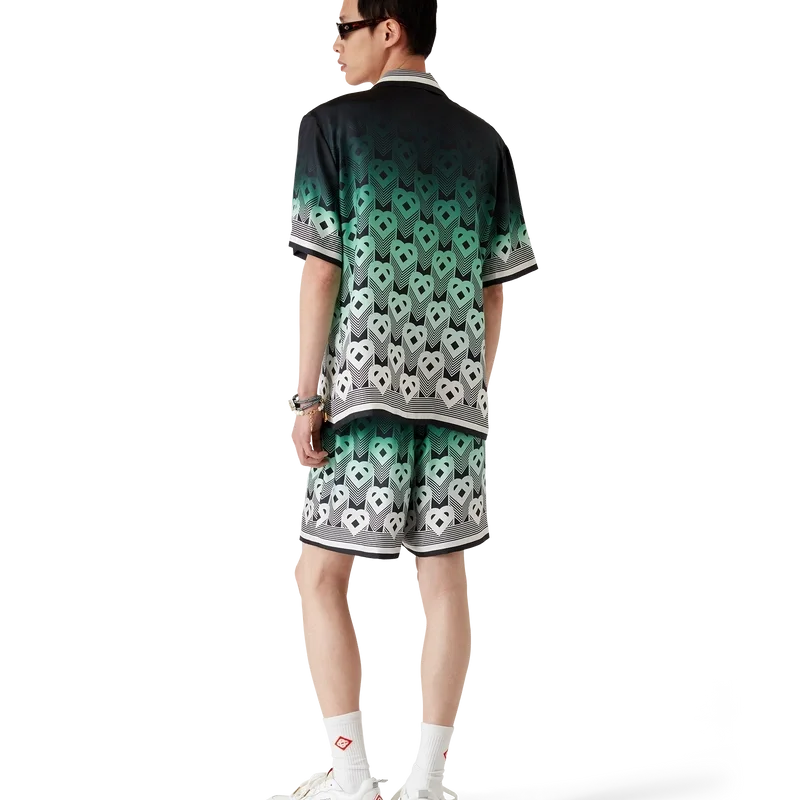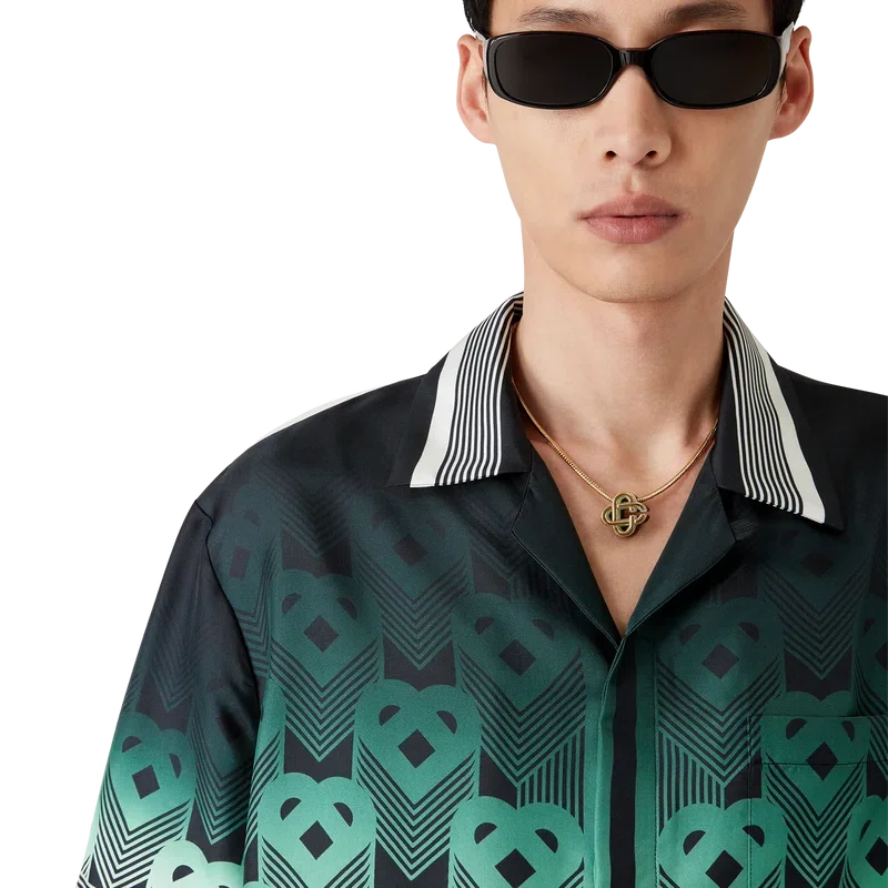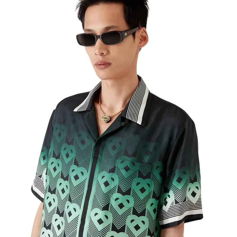 Het zijden overhemd met korte mouwen en monogram in kleurverloop heeft een all-over print met het hartmonogram van het huis tegen een mintkleurig kleurverloop dat is geïnspireerd op de kleurstelling van het Park Hyatt – een iconisch hotel in Tokio dat mint en zwart gebruikt in het interieurontwerp – vervaardigd van een zijden twill met monogram. Afgewerkt met een Cubaanse kraag, een borstzak, verborgen knoopsluiting, Corozo-knopen met het CC-logo en gestreepte randen op de kraag, manchetten, knoopsluiting en zoom.