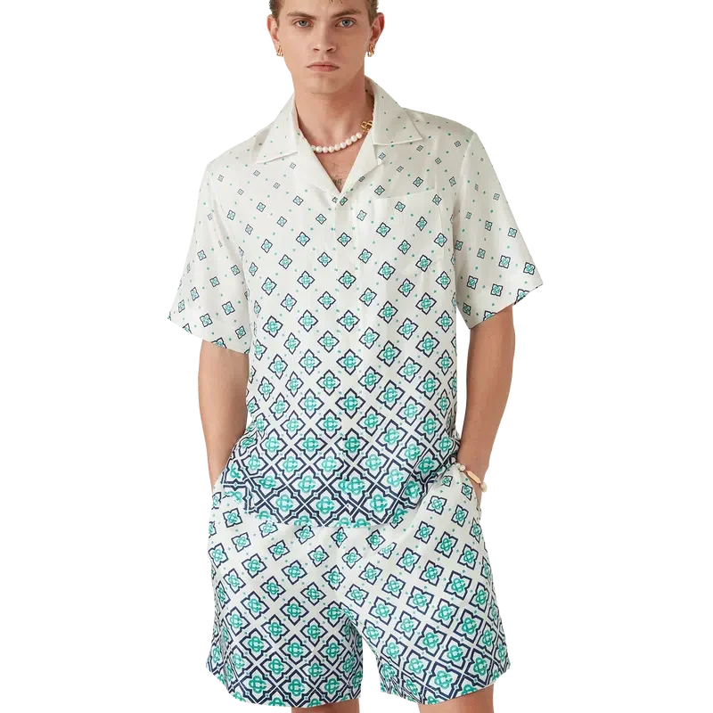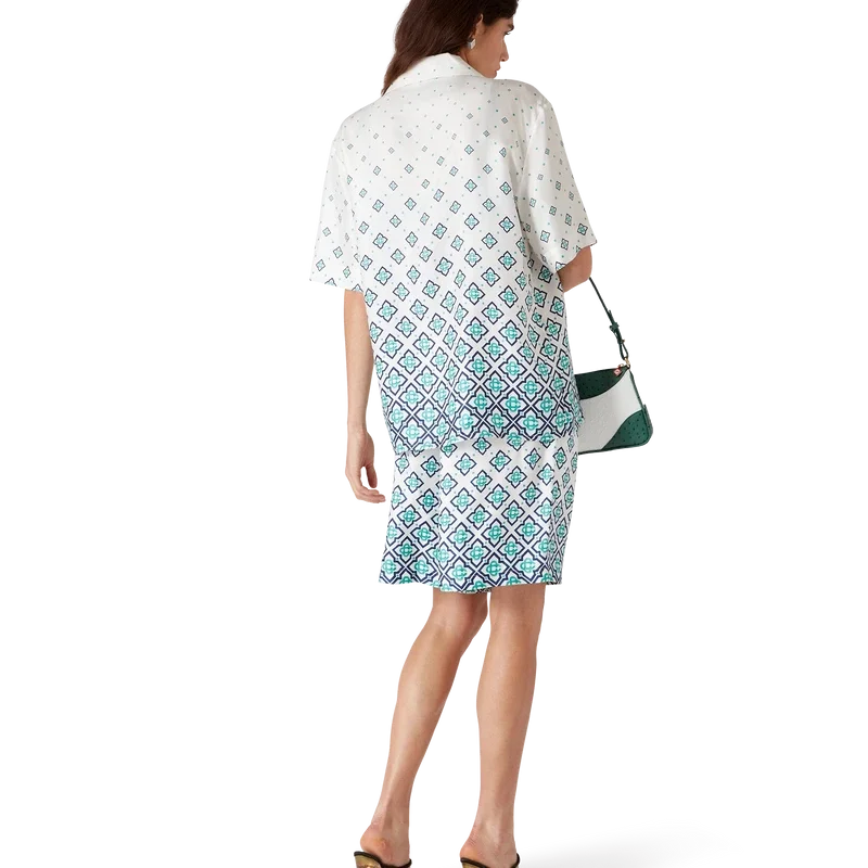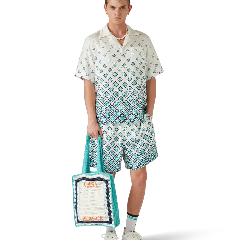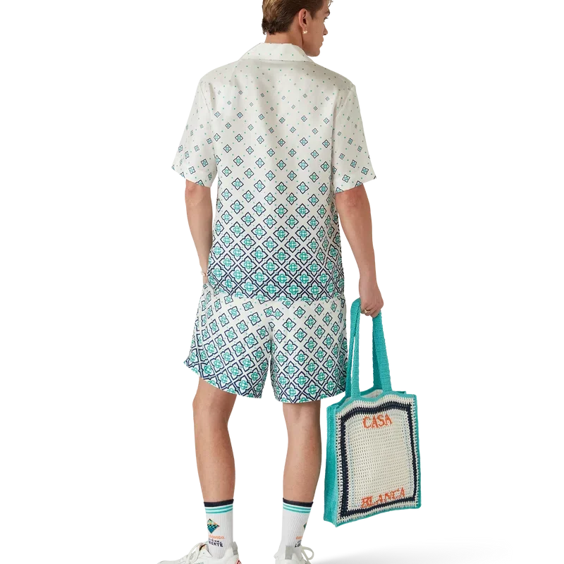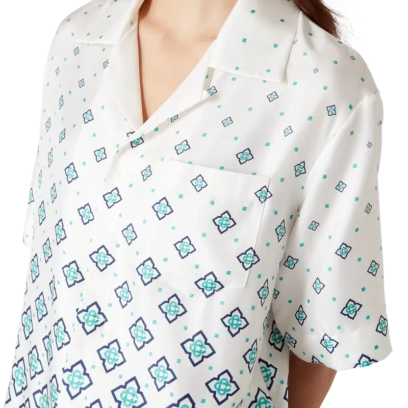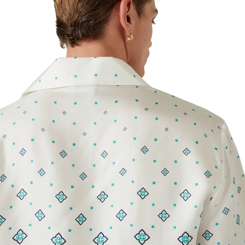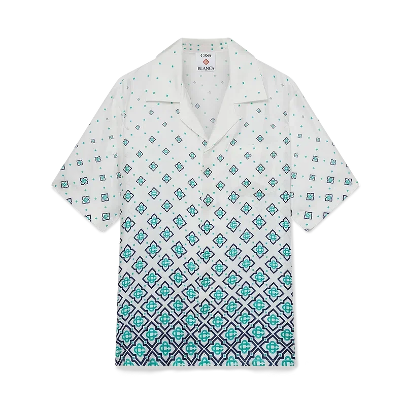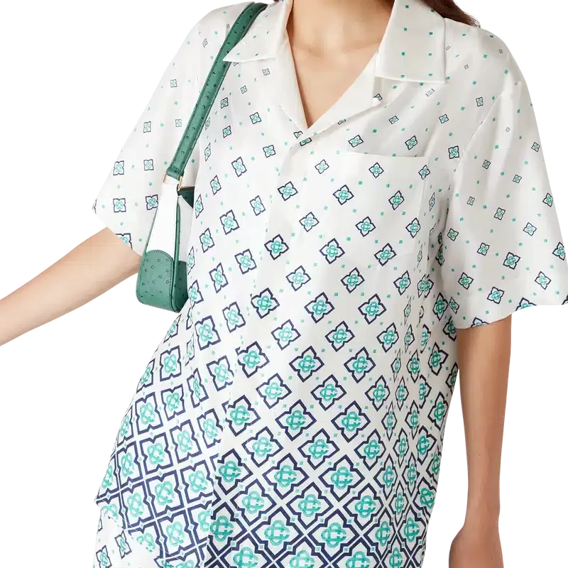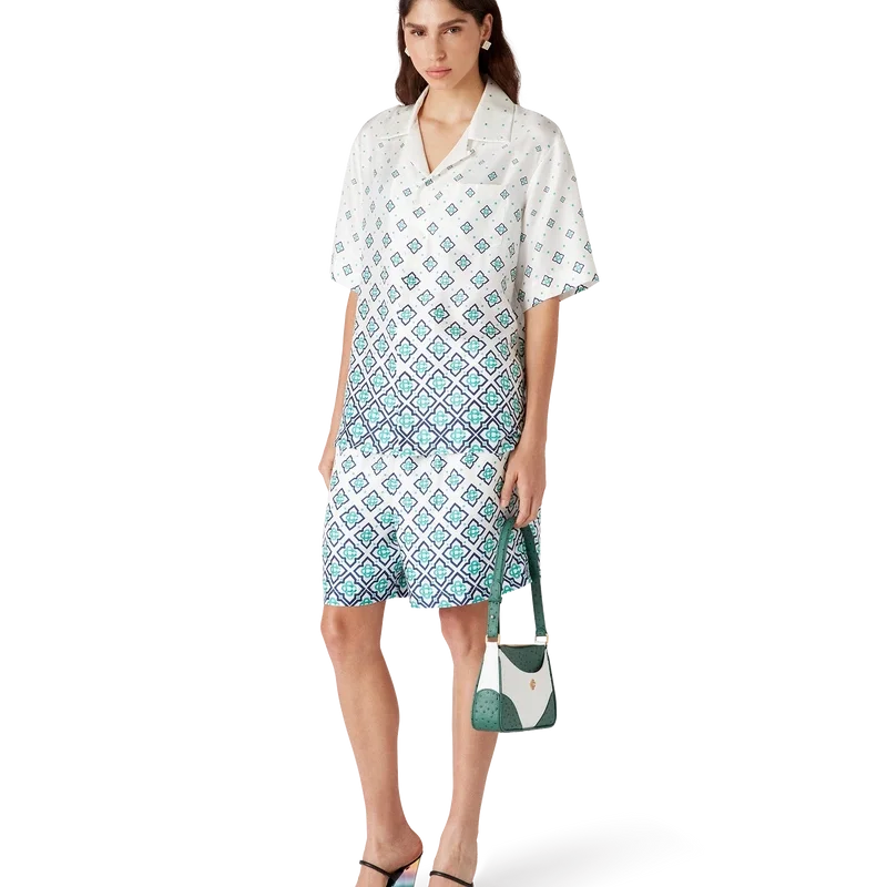 Het zijden overhemd met monogram in kleurverloop is een bedrukt ontwerp met korte mouwen, vervaardigd van zijden twill. Afgewerkt met een Cubaanse kraag, een verborgen knoopsluiting met in elkaar grijpende Cc-logo Corozo-knopen en een borstzak.