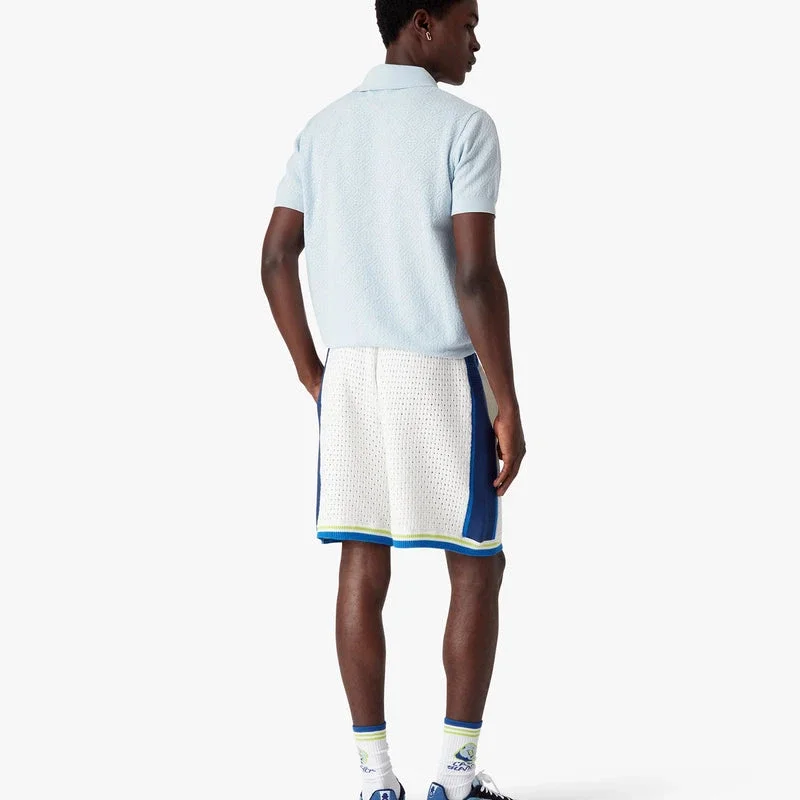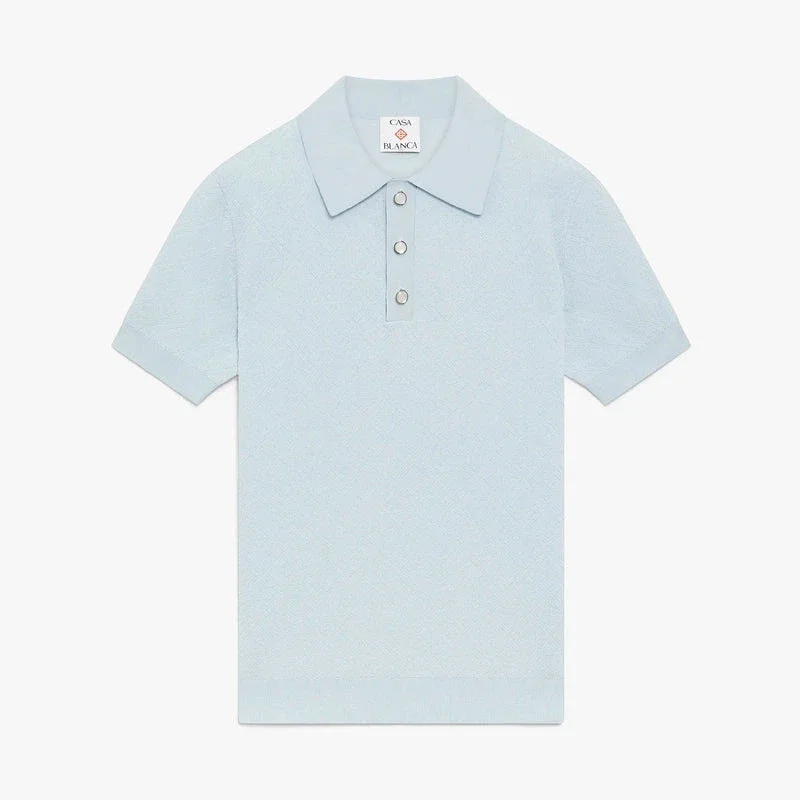 Het blauwe poloshirt met korte mouwen en pointelle-monogram is een verfijnd gebreid ontwerp, met een open pointelle-textuur en het kenmerkende monogrampatroon van het huis. Afgewerkt met een geribde kraag en knoopsluiting, kenmerkende gouden parelknopen en geribde manchetten en zoom.