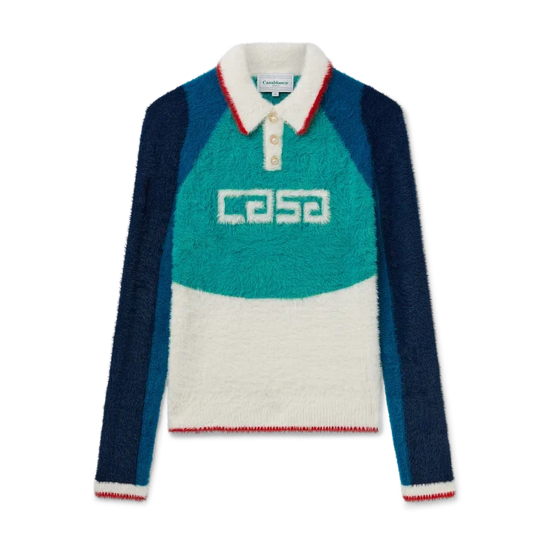 Het Casa Sport Fluffy poloshirt is een model met lange mouwen, vervaardigd uit een zachte gebreide stof. Afgewerkt met de kenmerkende parelknopen met gouden rand van het huis, een geribde kraag, manchetten en zoom met contrasterende randdetails, en de tekst ‘Casa’ op de borst in een Grieks geïnspireerde Greek Key-stijl.