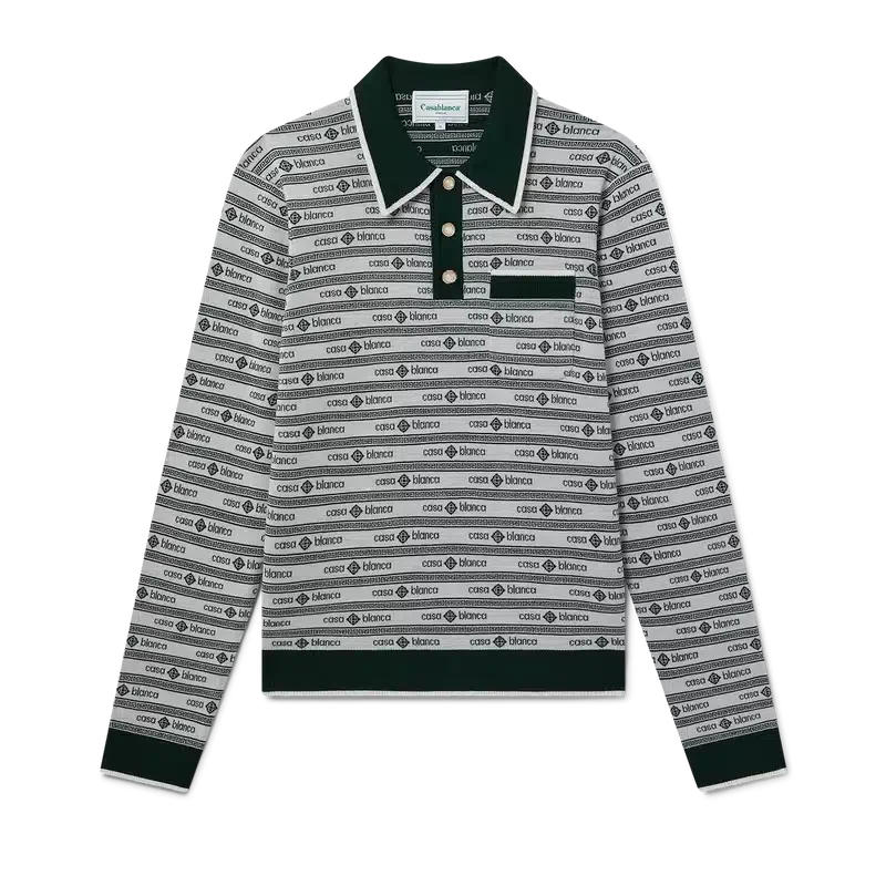Het Evergreen Logo Poloshirt is een ontwerp met lange mouwen en het Casablanca-logo van het huis, vervaardigd uit merinowol. Afgewerkt met kenmerkende parelknopen met gouden rand, een borstzak en contrasterende ribdetails met witte randen op de kraag, manchetten, zoom, knoopsluiting en zak.