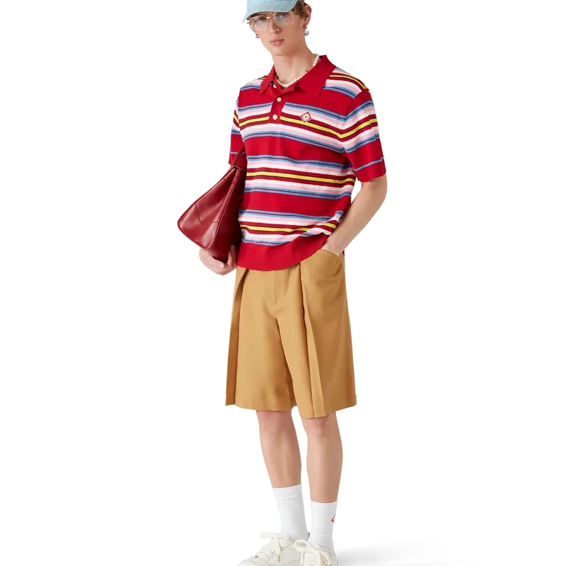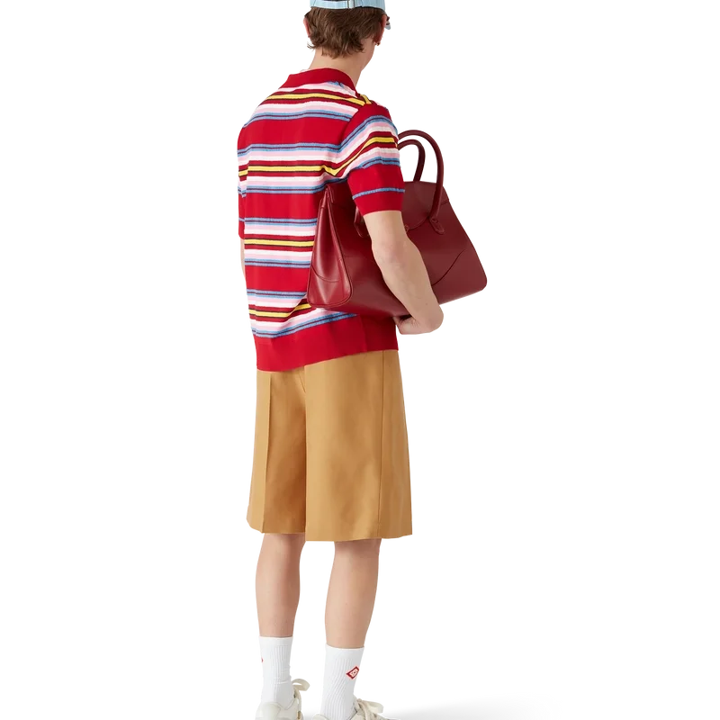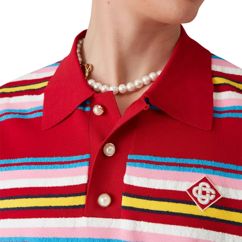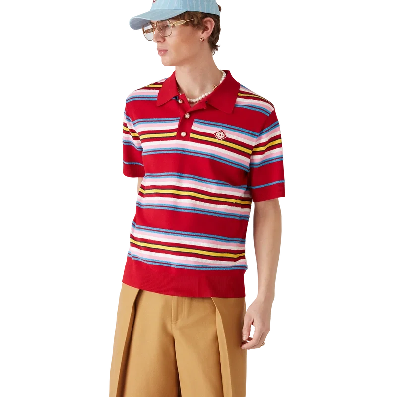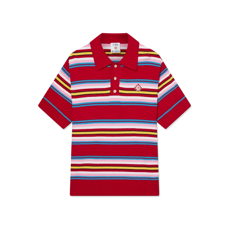 Het gestreepte oversized poloshirt is een ontwerp met korte mouwen, vervaardigd uit gestreepte gebreide stof met het kenmerkende diamantlogo van het huis. Afgewerkt met kenmerkende parelknopen met gouden rand, een knoopsluiting met drie knopen en geribde manchetten, zoom, kraag en knoopsluiting.