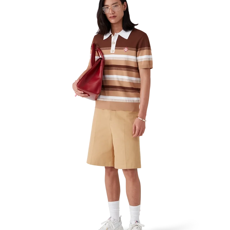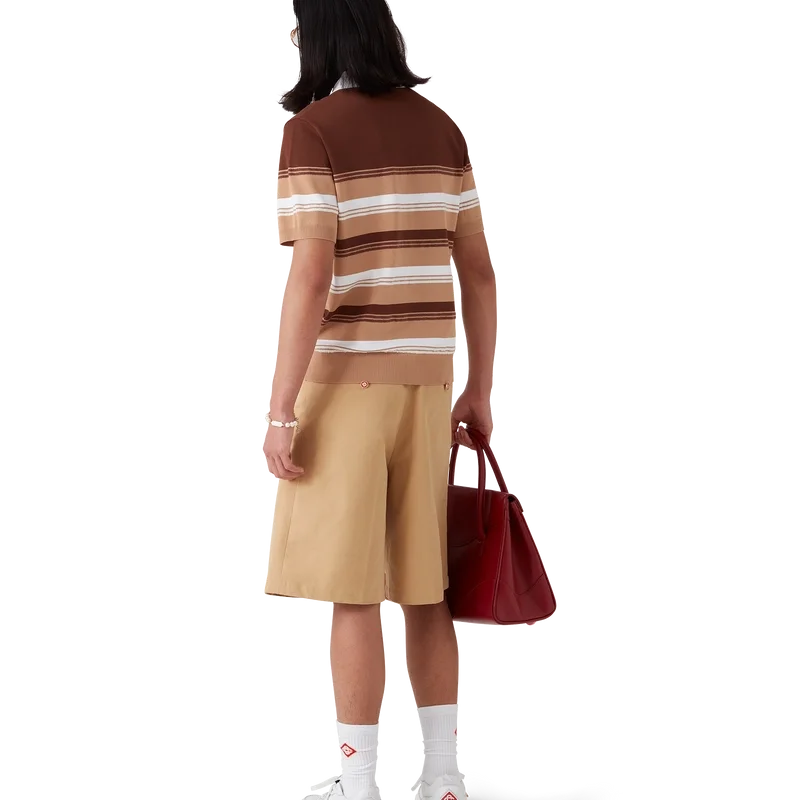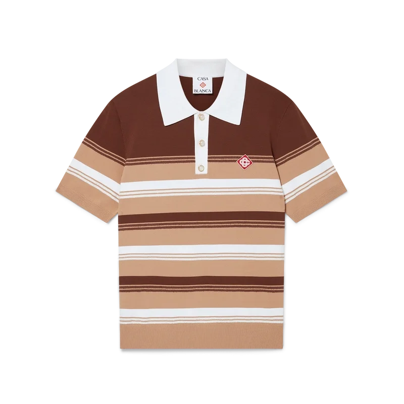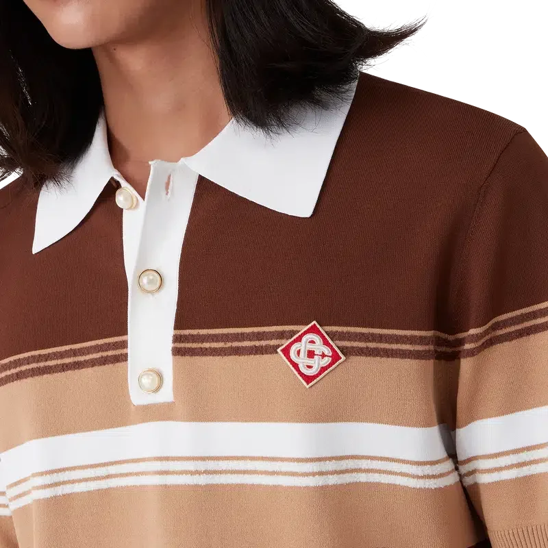 Het gestreepte poloshirt is een model met korte mouwen, vervaardigd van gestreepte gebreide stof en voorzien van het kenmerkende diamantlogo van het huis. Afgewerkt met kenmerkende parelknopen met gouden rand, een knoopsluiting met drie knopen en geribde manchetten, zoom, kraag en knoopsluiting.