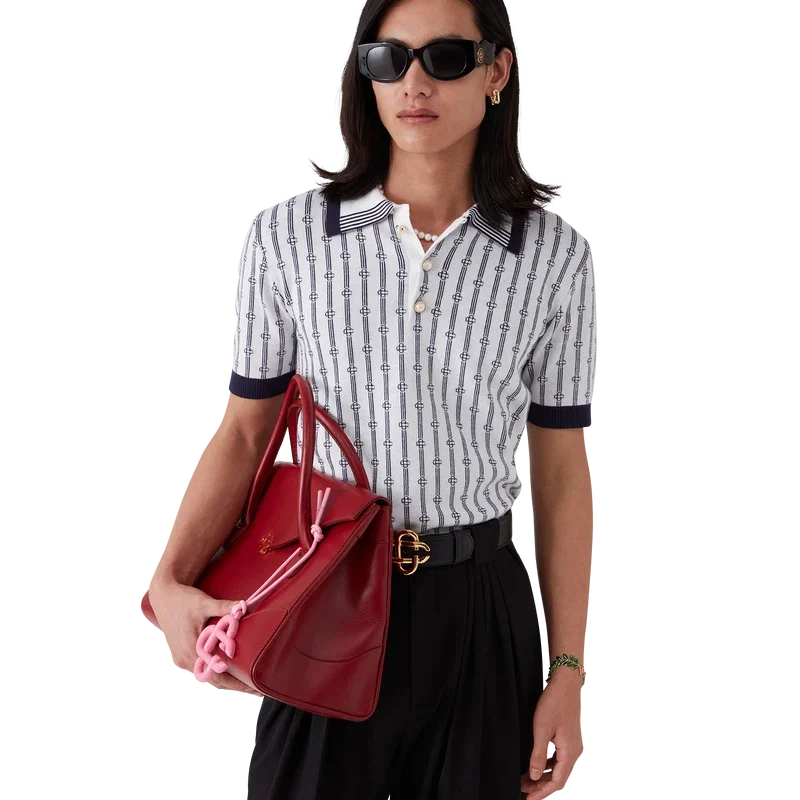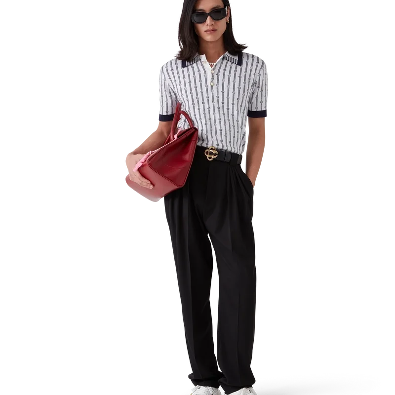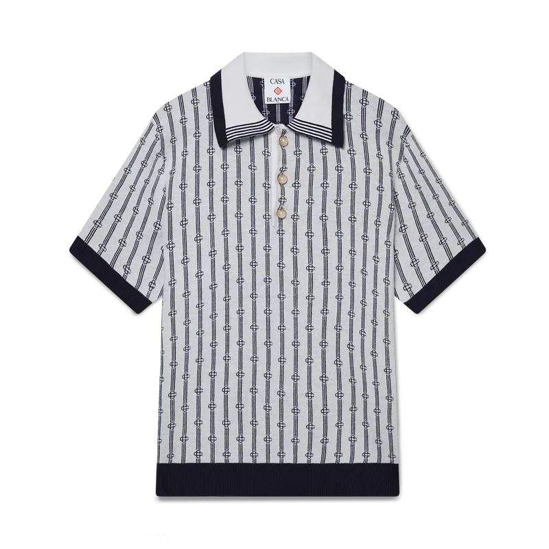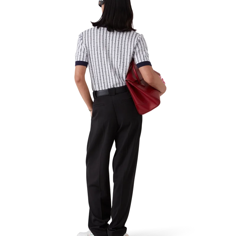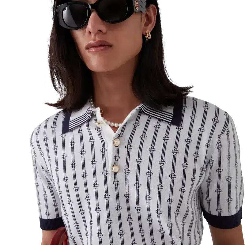 Het Monogram poloshirt is een model met korte mouwen, vervaardigd uit een katoenmix met een klassieke knoopsluiting met drie knopen. Afgewerkt met de kenmerkende parelknopen met gouden rand van het huis, geribde manchetten, zoom en kraag met randdetail.