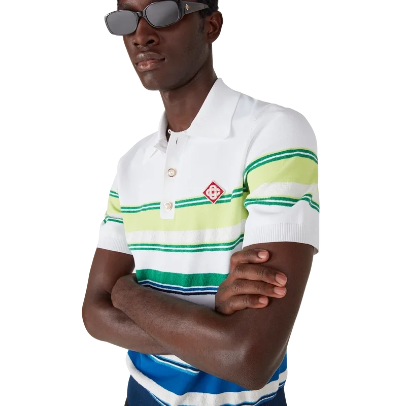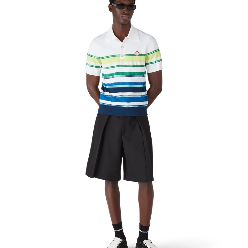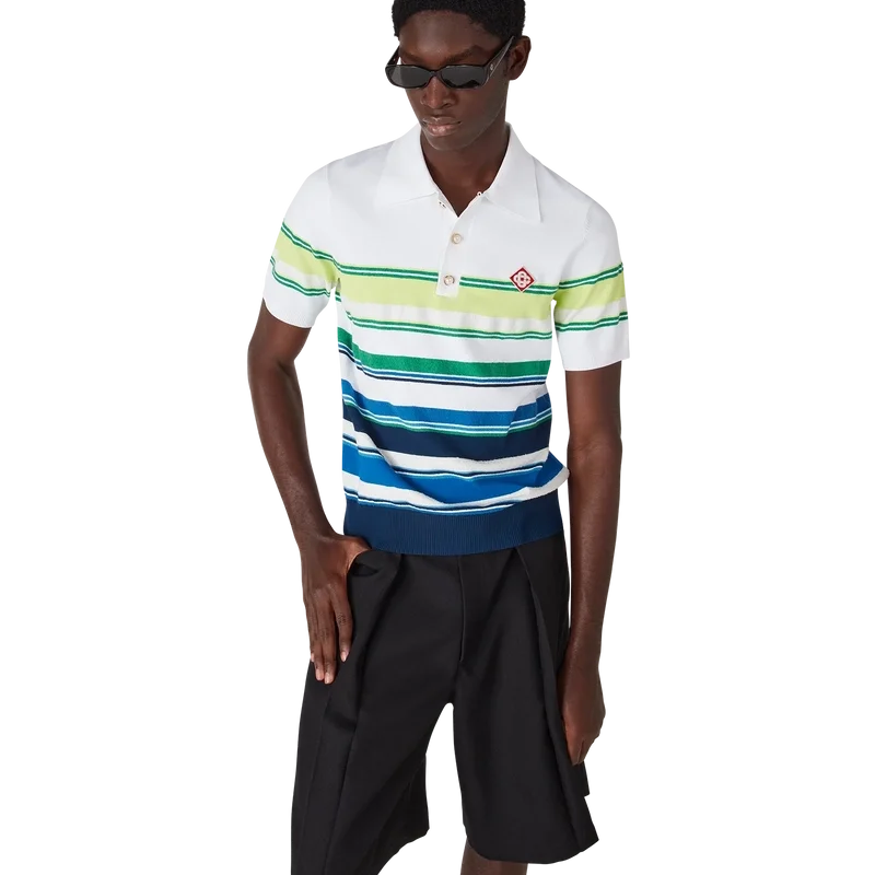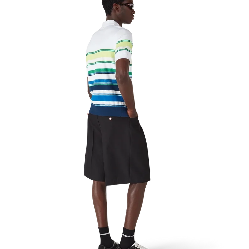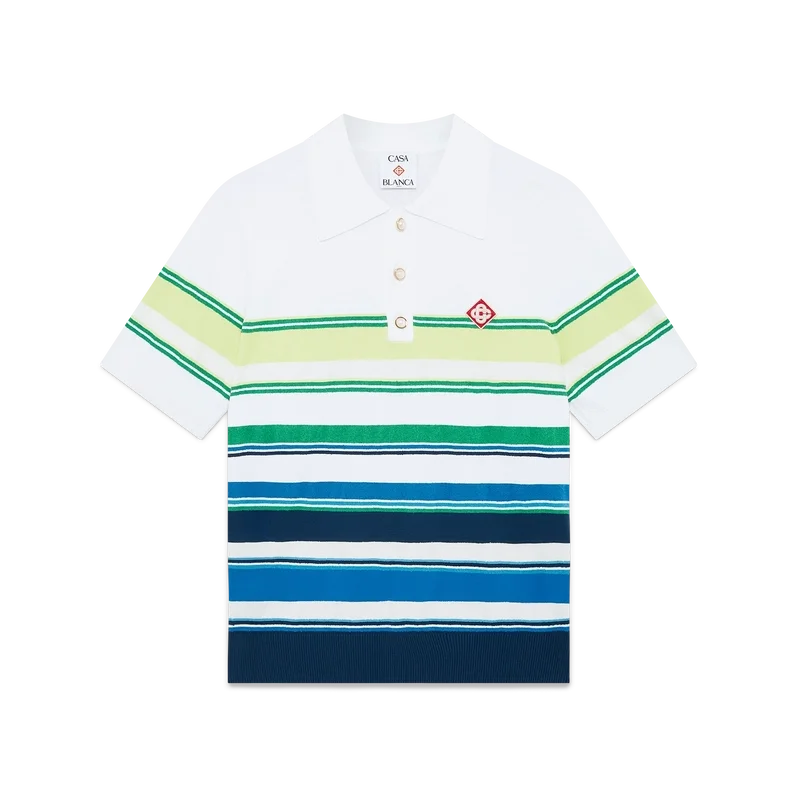 Het poloshirt met kleurverloopstrepen is een verfijnd gebreid ontwerp, vervaardigd uit viscose en voorzien van het kenmerkende diamantlogo van het huis. Afgewerkt met een geribde kraag, manchetten, zoom en knoopsluiting, streepdetails over het hele bovenstuk en een klassieke knoopsluiting met drie knopen met kenmerkende gouden parelknopen.