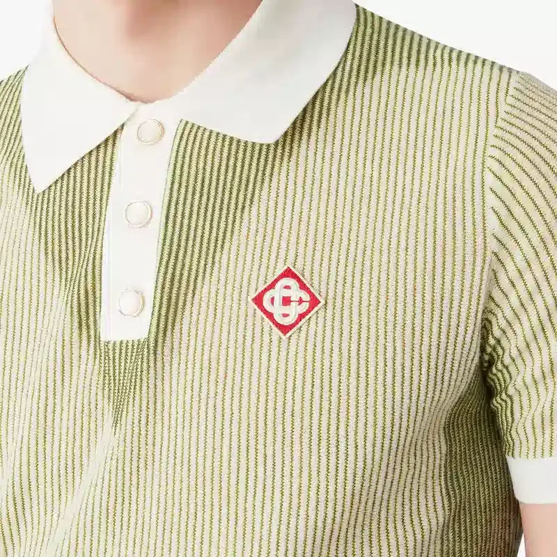 Het poloshirt met korte mouwen en verticale strepen heeft een verfijnd gebreid ontwerp en een relaxte pasvorm. Afgewerkt met een contrasterende kraag en knoopsluiting, kenmerkende gouden parelknopen, geribde manchetten en zoom, en het Warped-logo van het huis op de mouwen.