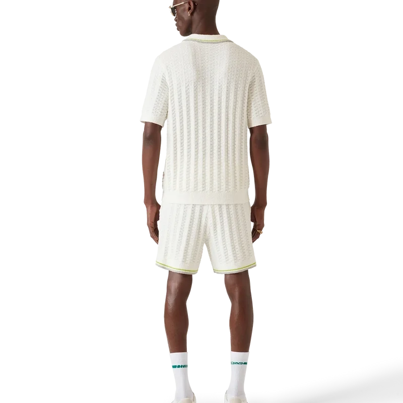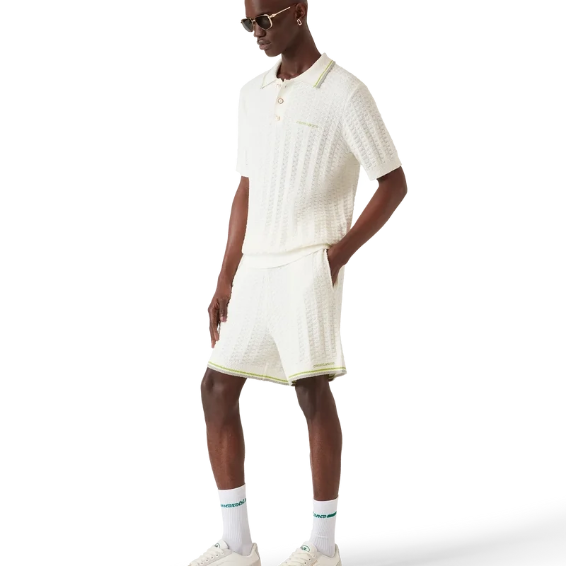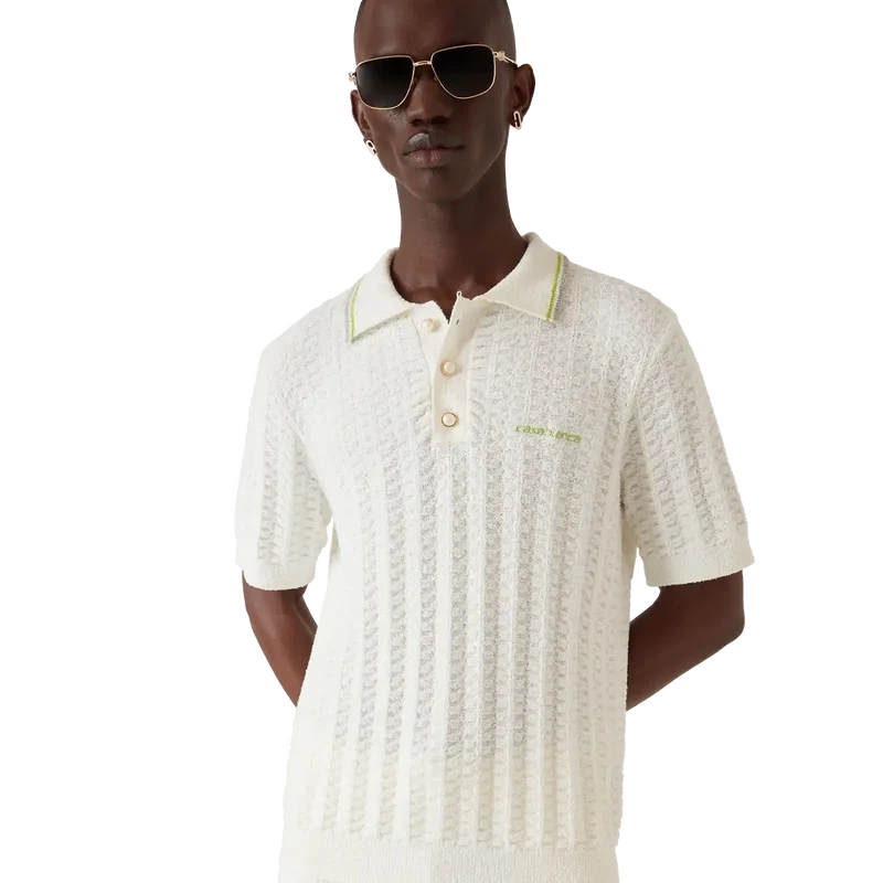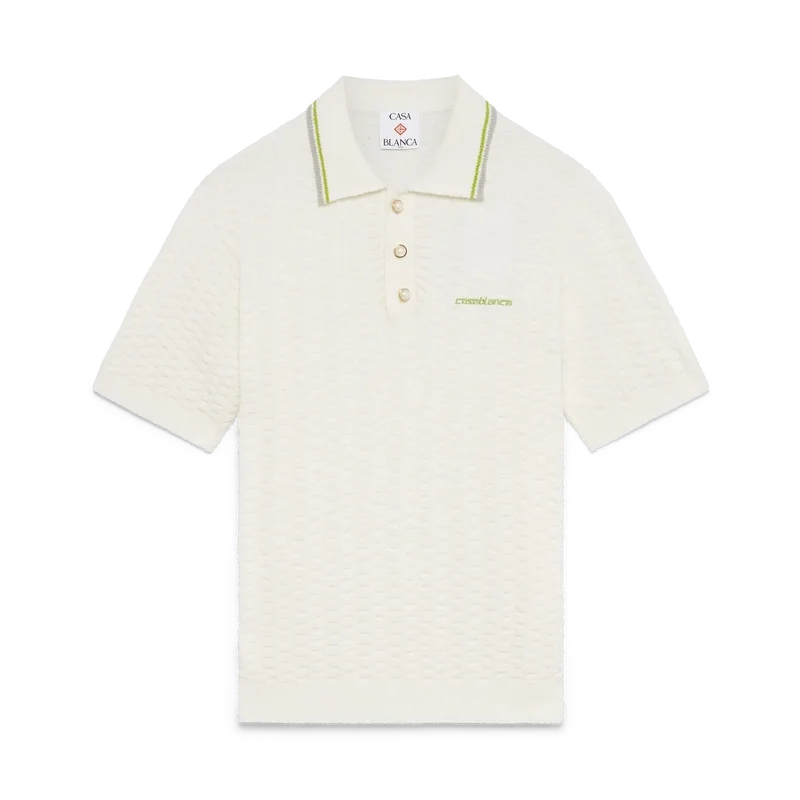 Het Tennis Bouclé Poloshirt is een ontwerp met korte mouwen en textuur, voorzien van het Casablanca-logo van het huis. Afgewerkt met het kenmerkende Casablanca-logo van het huis, een knoopsluiting met drie knopen, parelknopen met gouden rand en geribde details bij de kraag, manchetten en zoom.