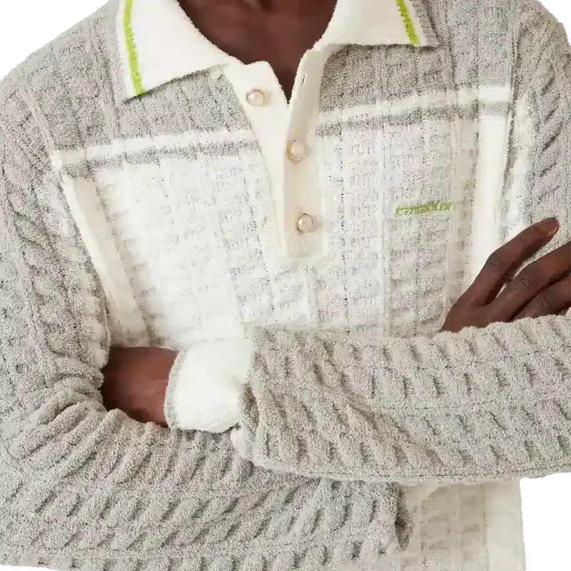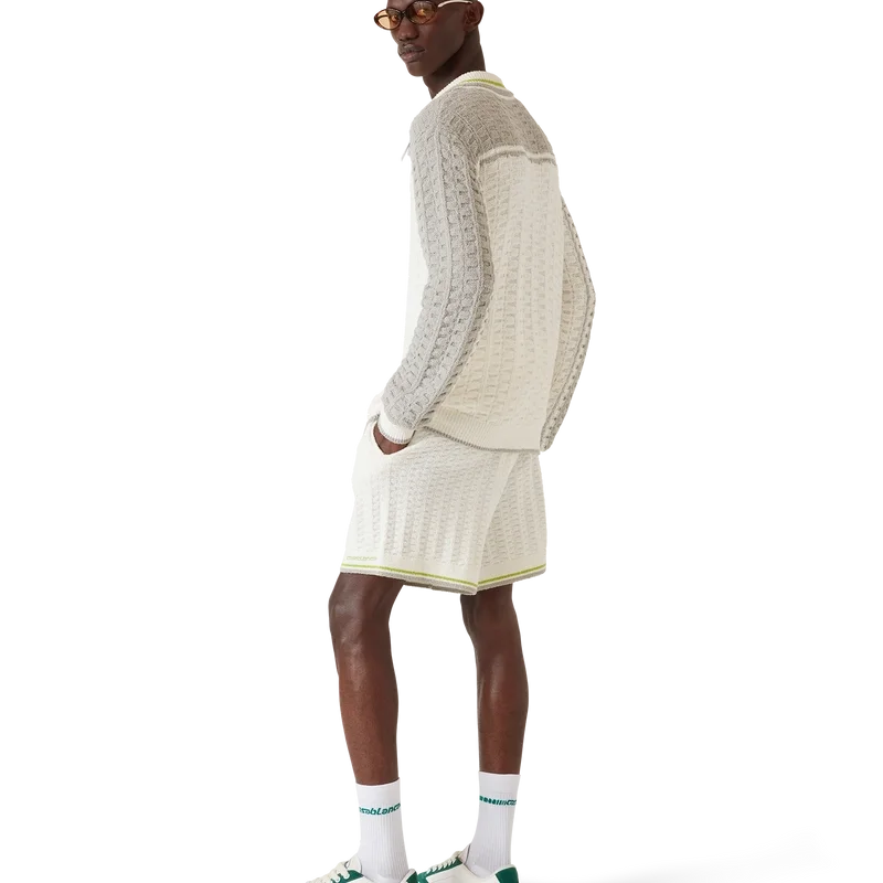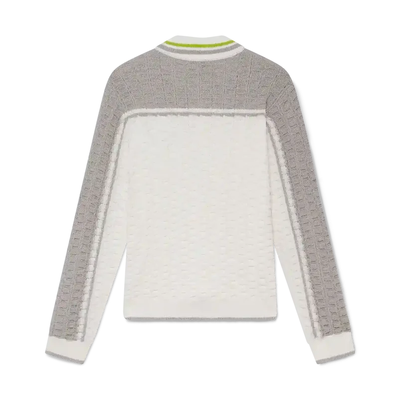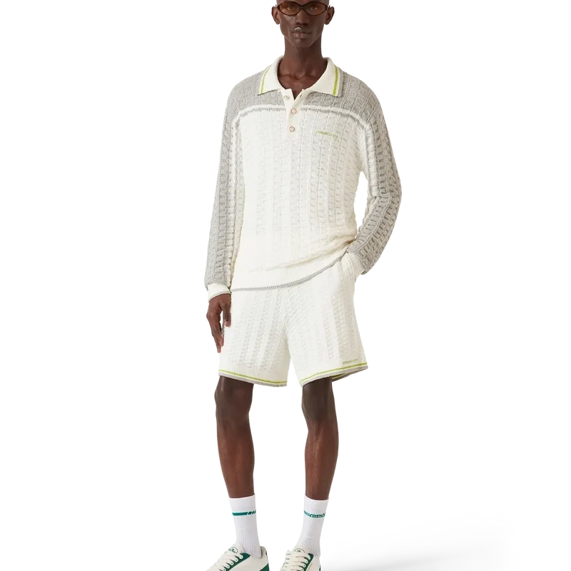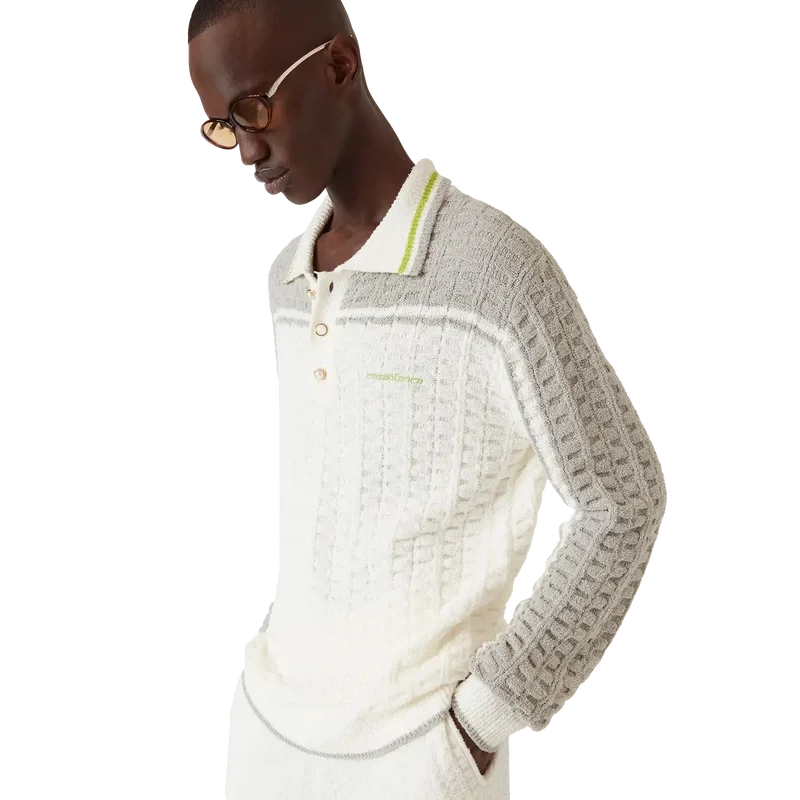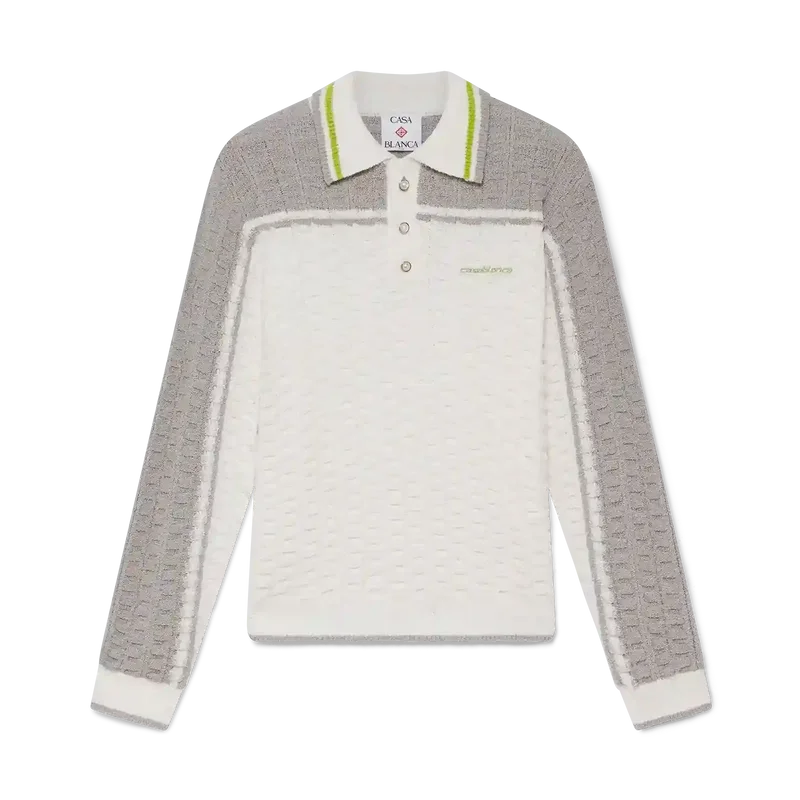 Het Tennis Bouclé poloshirt met lange mouwen heeft een gestructureerd ontwerp met contrasterende schouders en buitenmouwen. Afgewerkt met een geribde knoopsluiting met drie knopen, een kraag met gestreepte randdetails, het kenmerkende Casablanca-logo, parelknopen met gouden rand en geribde manchetten en zoomdetails.