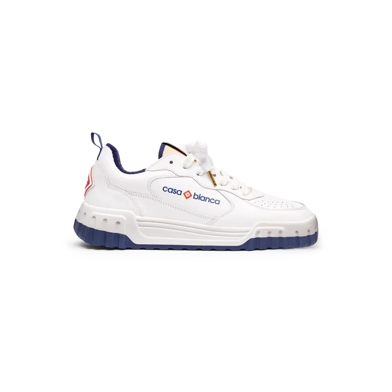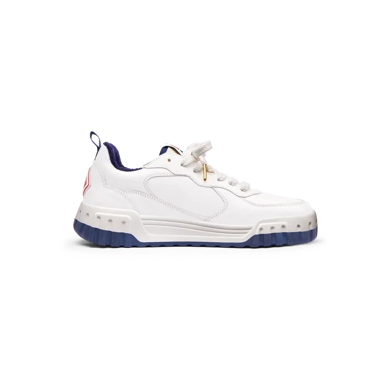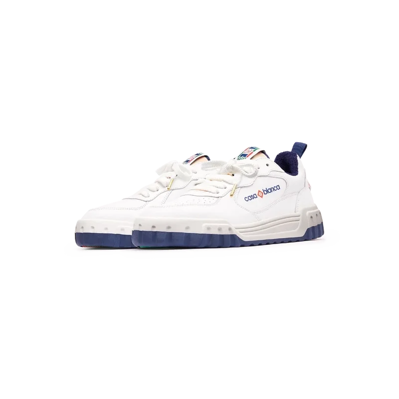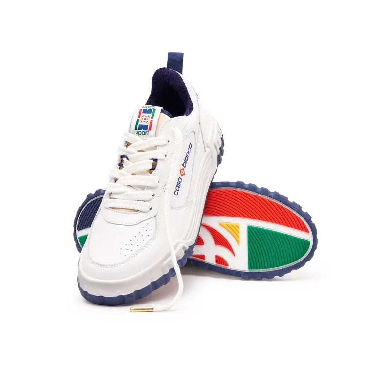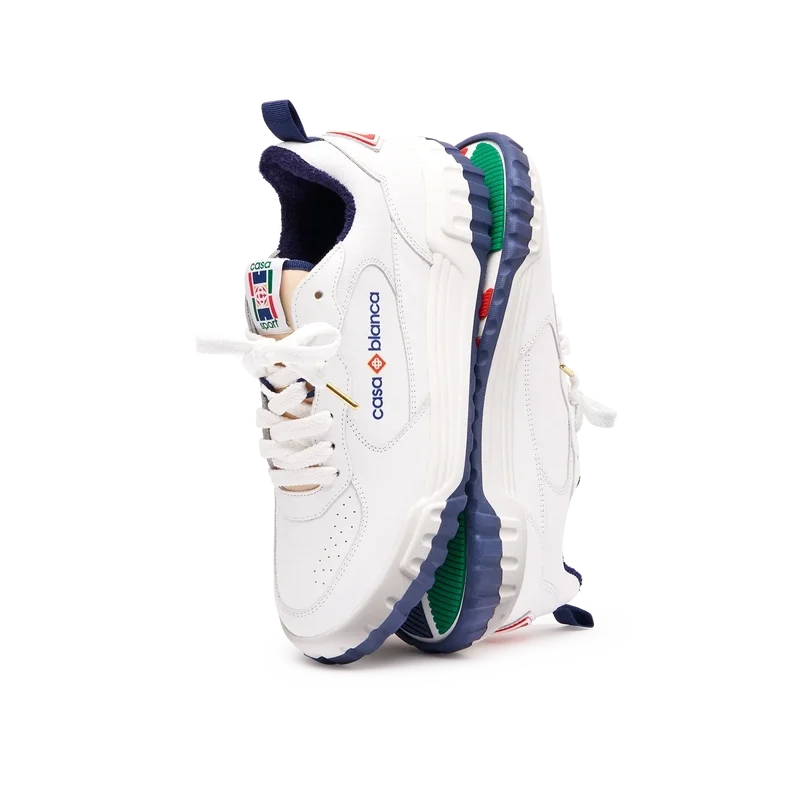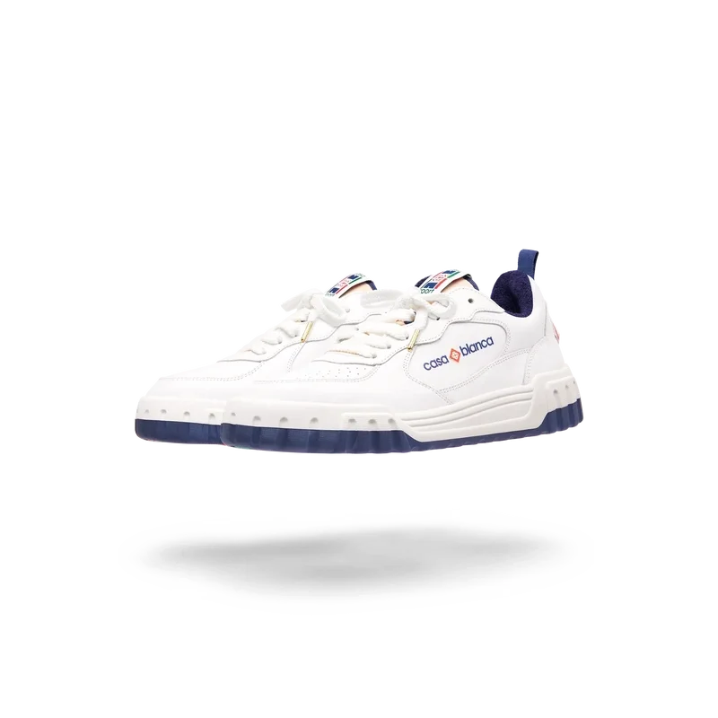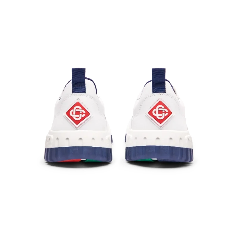 Het bovenwerk van de schoen heeft geïntegreerde, vloeiende paneellijnen als knipoog naar de iconische silhouetten van de jaren 90. Het prominente Casablanca-logo is overal duidelijk zichtbaar, inclusief het kenmerkende diamantmotief van het merk op de hiel, het siliconen woordmerk op de zijkant en het geweven tonglabel en de binnenzool met het tennisbaanmotief, waaraan de schoen zijn naam, de Court, te danken heeft.