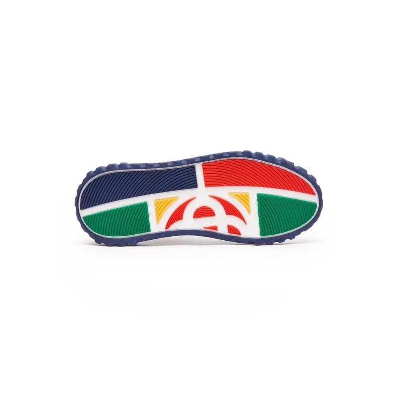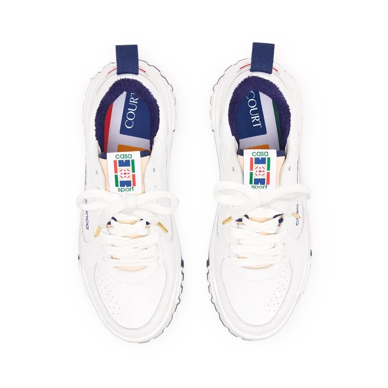 De ontwerptaal van de Court-sneaker weerspiegelt de iconische silhouetten van de jaren 90. De kleuren op de rubberen zool zijn een combinatie van de verfijnde codes van tennis en klassieke architectuur en creëren een uniform kleurenpalet over de hele schoen, waarbij de nadruk ligt op primaire kleuren die worden gecompenseerd door tenniswit om een sportief kleurverhaal te creëren.