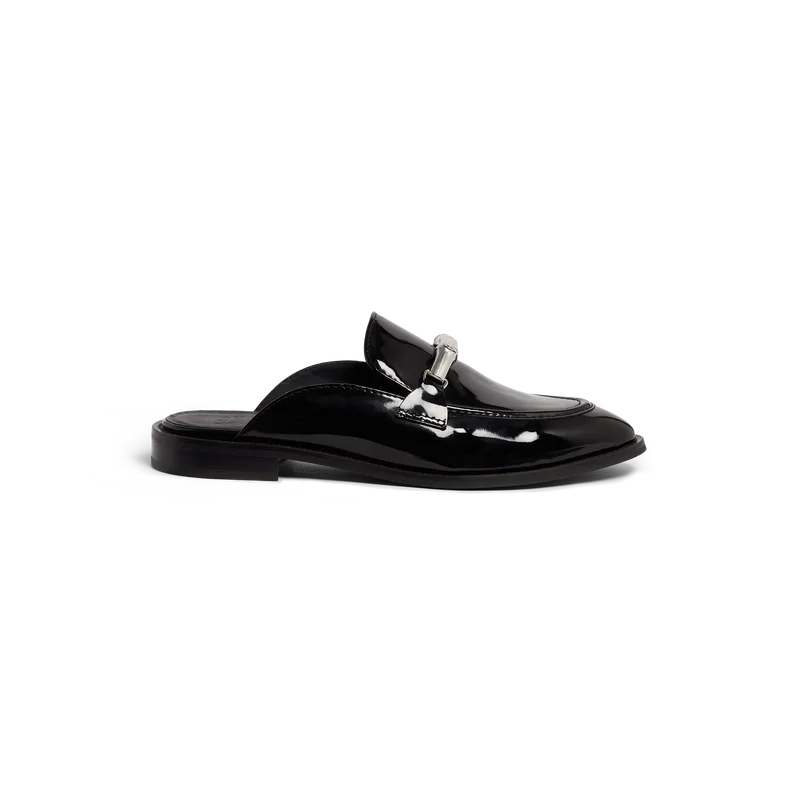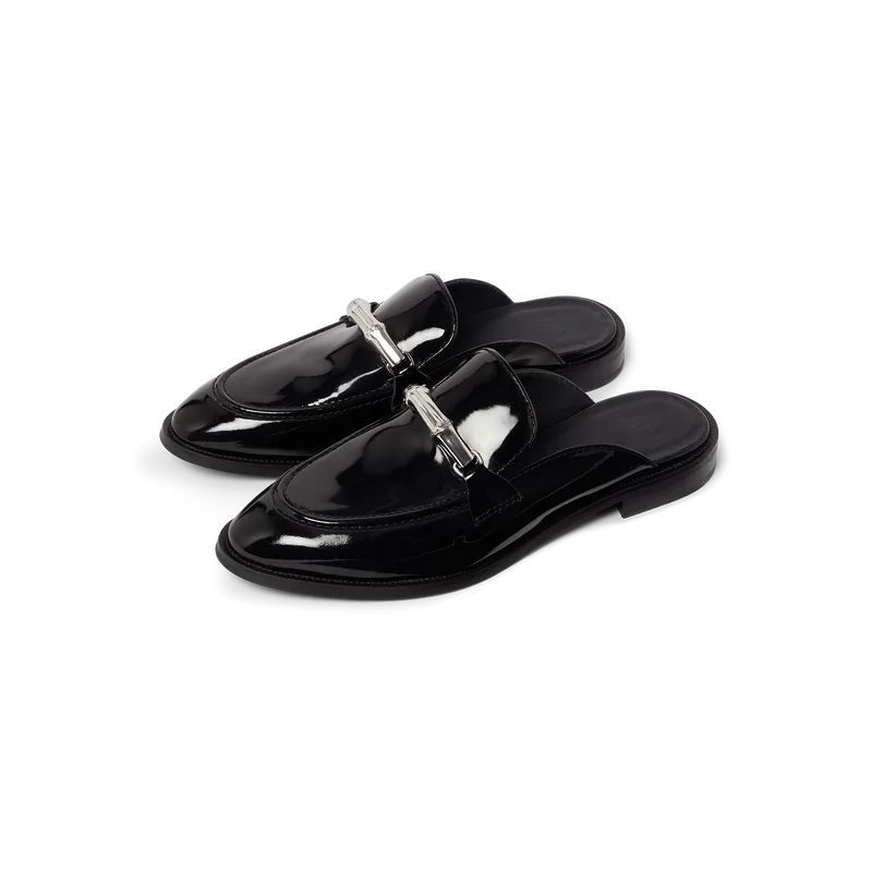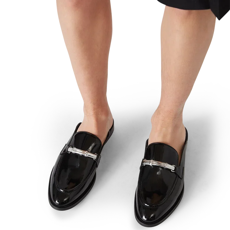 De zwarte bamboe instaploafer is een plat model zonder achterkant en met gesloten teen, vervaardigd uit Italiaans kalfsleer. Afgewerkt met onze iconische bamboeband, leren voering, leren zool, vergulde details en een blokhak van 10 mm.