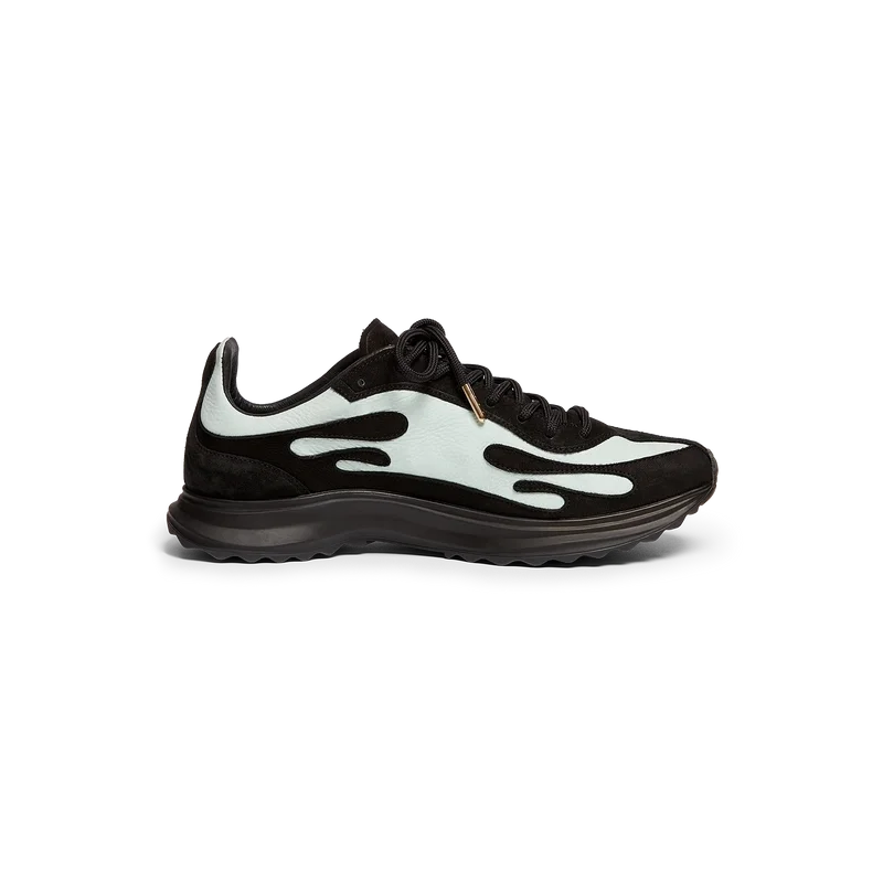 De Stade-sneaker voor dames in zwart en mint ontleent zijn naam aan de oude Griekse maat voor de afstand van een hardloopwedstrijd, wat later het woord voor stadion werd. Het model is geïnspireerd op prestatiegerichte hardloopschoenen en is een overbrenging van moderne technologie vanuit een oude traditie. Het bovenwerk van de sneaker is vervaardigd uit leer en de zool is van rubber.