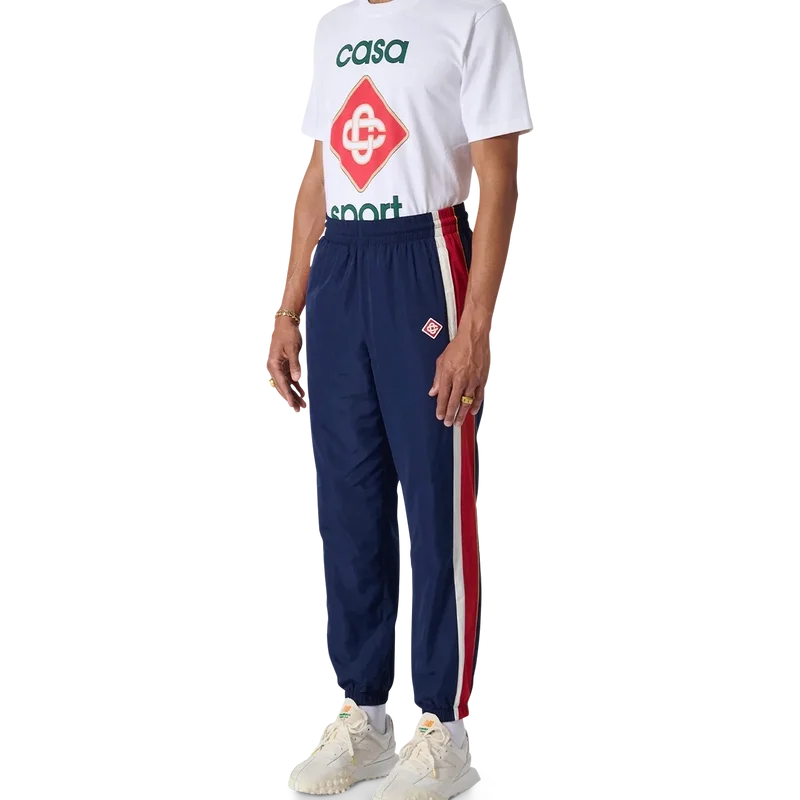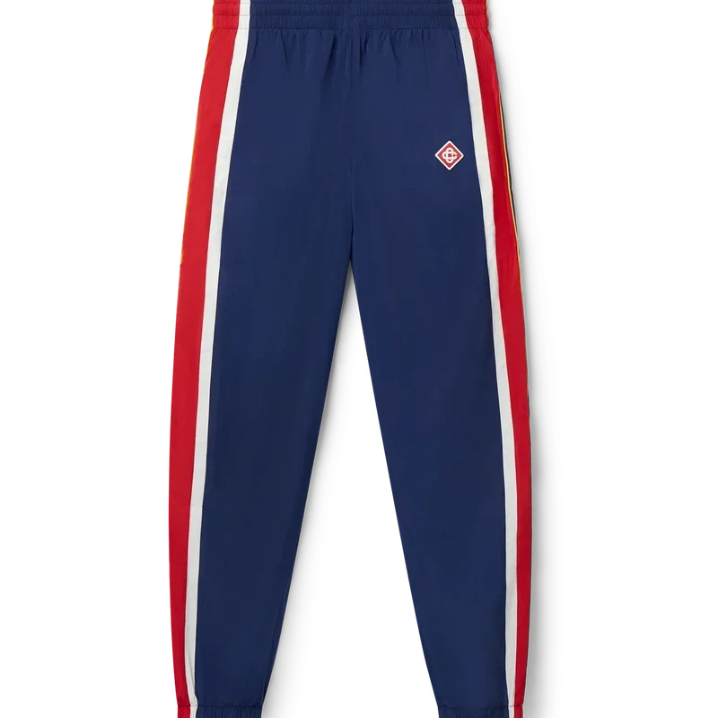 De Arch Panelled Shell trainingsbroek is een nostalgische sportbroek, vervaardigd uit polyester taffeta met panelen in wit, rood en marineblauw. Afgewerkt met trekkoorden met gouden uiteinden, elastische boorden en zijzakken. Ontworpen voor een klassieke pasvorm met het Casablanca Paris Diamond Monogram-logo geborduurd op het linkerbeen.
