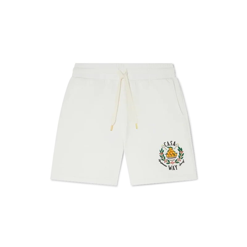 De Casa Way Sweatshorts zijn voorzien van het geborduurde kenmerkende kunstwerk van het huis, opnieuw geïnterpreteerd voor dit seizoen. De shorts zijn gemaakt van 100% biologisch katoen, vallen boven de knie en zijn afgewerkt met een trekkoord met gouden uiteinden, zijzakken, een achterzak en een Casablanca-merklabel.
