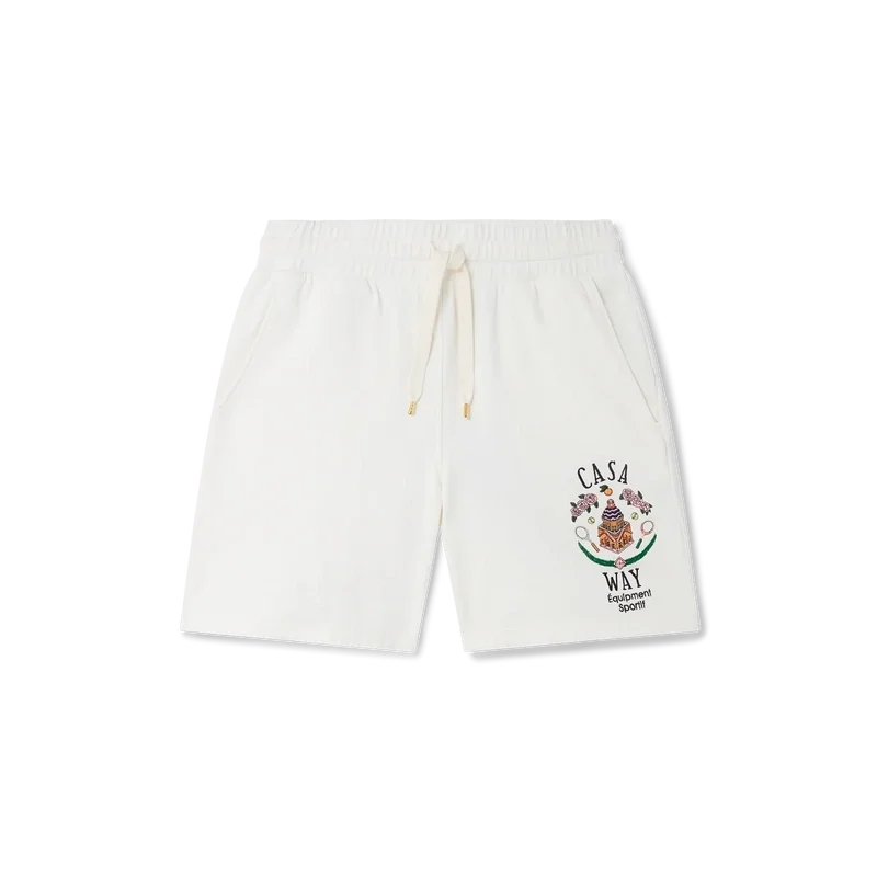 De Casa Way gebroken witte biologische katoenen sweatshorts zijn voorzien van het kenmerkende artwork van het huis met geborduurde illustraties van sportuitrusting en bloemendetails, opnieuw geïnterpreteerd voor dit seizoen. Afgewerkt met een trekkoord met gouden uiteinden, zijzakken en een Casablanca Paris-merklabel, ontworpen voor een klassieke pasvorm.