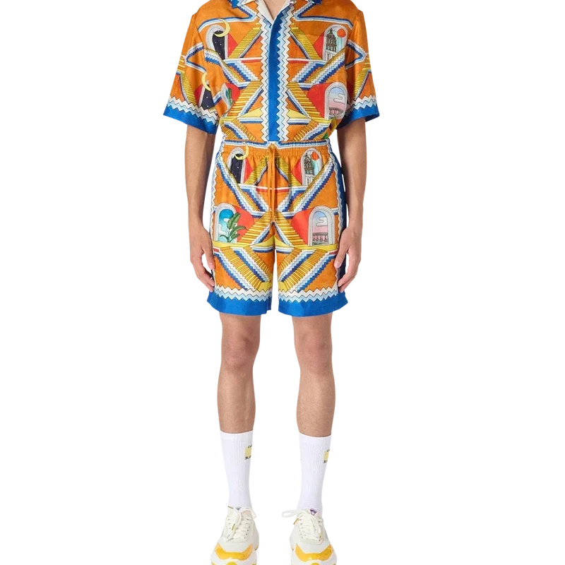 De Escalier Infini zijden herenshort is voorzien van de stralende, oneindige trap-print van dit seizoen. Afgewerkt met een contrasterende blauw-witte zigzagrand en een tailleband met trekkoord.