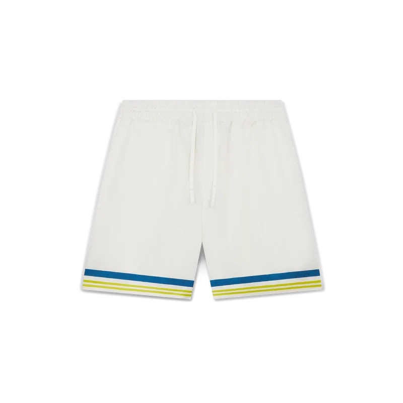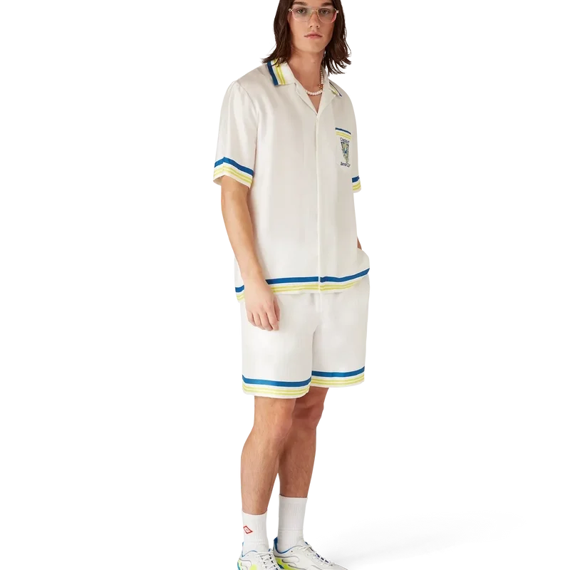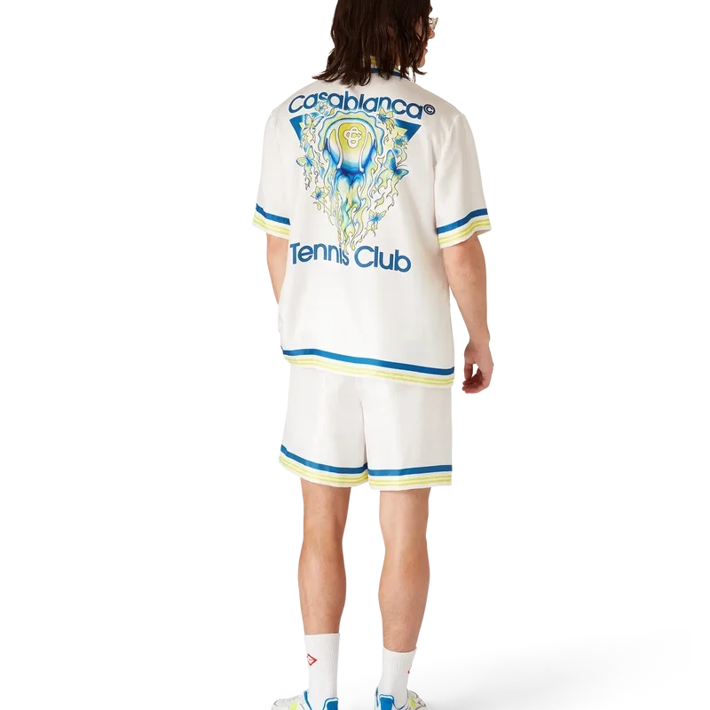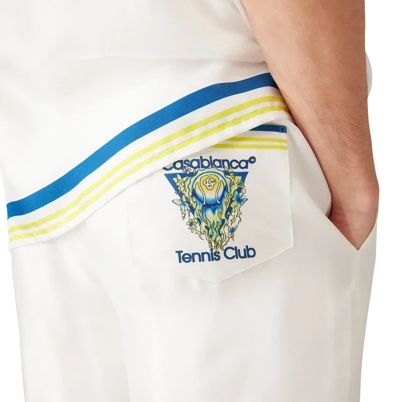 De Flaming Tennis Club Icon zijden Shorts heeft een print met het kenmerkende tennisbalmotief van het huis in vlucht, wat de fundamentele balans tussen kracht, snelheid en controle weerspiegelt. Afgewerkt met een elastische tailleband, trekkoordsluiting, zijzakken in de naad en een opgestikte zak aan de achterkant.
