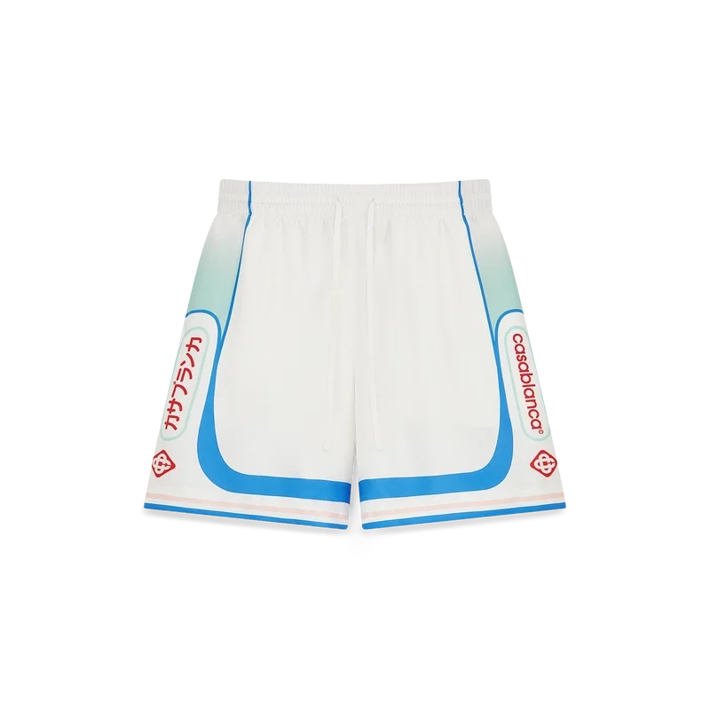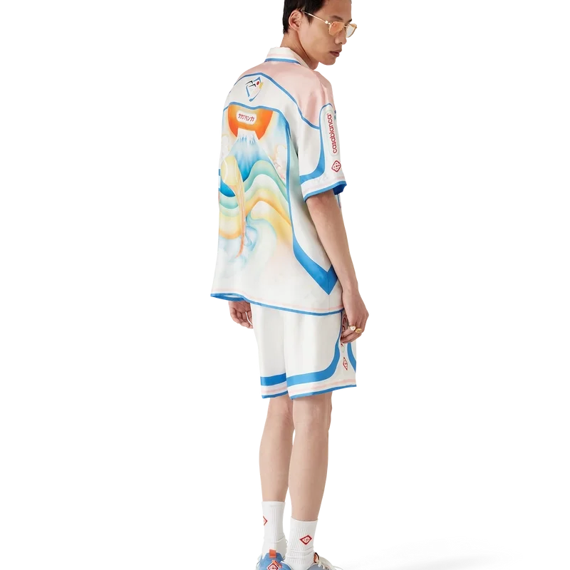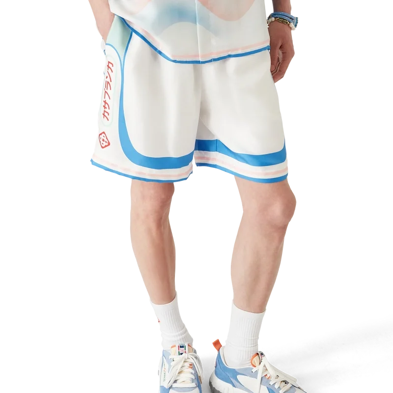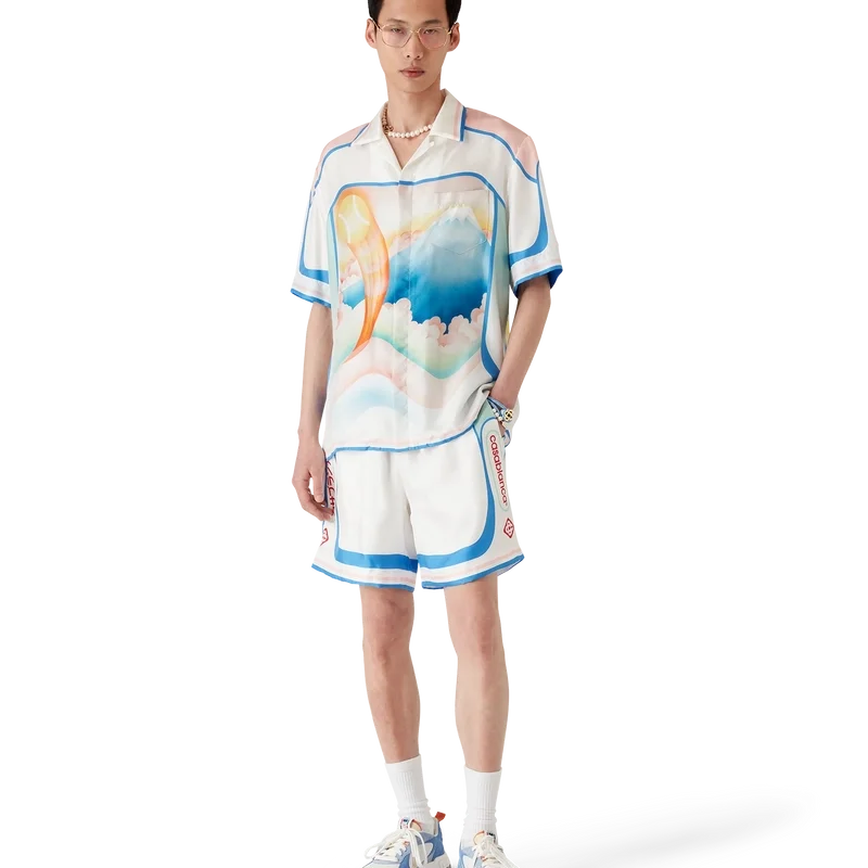 De Fuji Dream zijden shorts hebben een print met een ontwerp dat een droomachtige visie op een reis naar de berg Fuji laat zien – vervaardigd van zijden twill. Afgewerkt met een elastische tailleband, zijzakken in de naad, een achterzak, gestreepte zoomdetails en een print aan de zijkanten.
