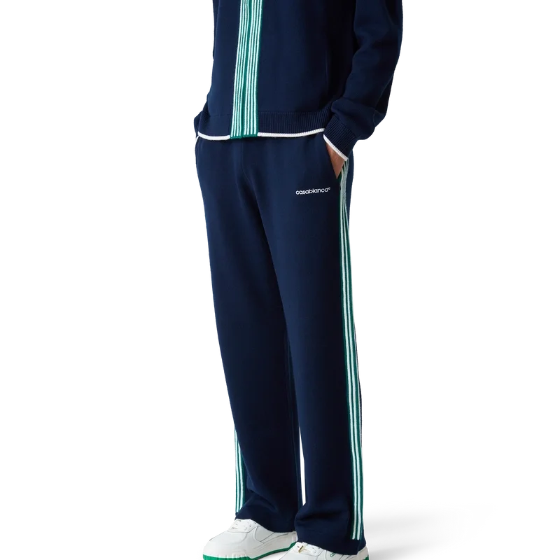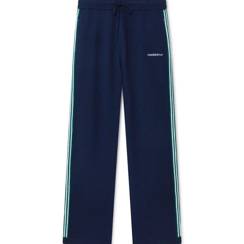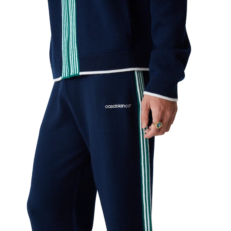 De gebreide tennisbroek heeft een op sportkleding geïnspireerd ontwerp en is gemaakt van merinowol. Afgewerkt met contrasterende geribde randen aan de manchetten, zoom, kraag en sluiting, ritssluiting aan de voorkant, een trechterkraag en Casablanca-logo.