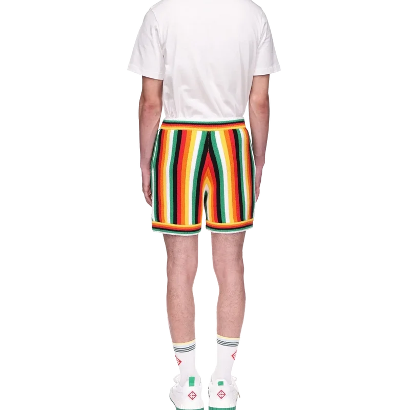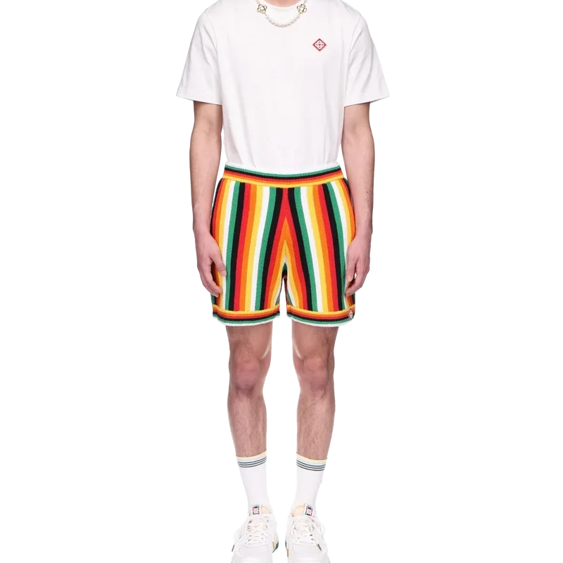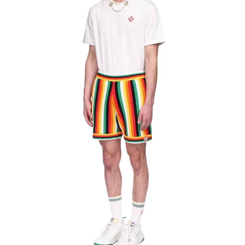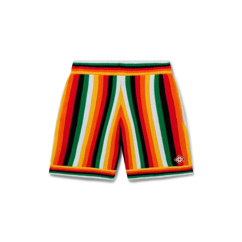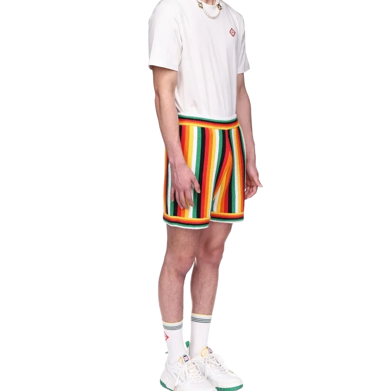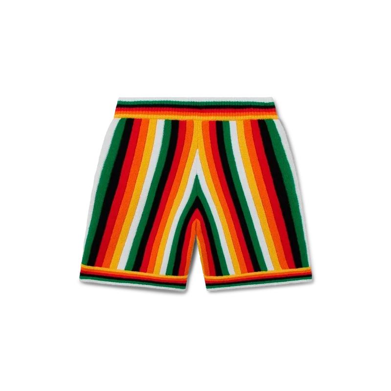 De gestreepte badstofshort is een gebreid ontwerp, vervaardigd van een katoenmix badstof en voorzien van de kleuren van het seizoen, die symbool staan voor de rijke uitwisselingen tussen culturele disciplines in de Afrikaanse kunst, muziek en film. Afgewerkt met een elastische tailleband, zijzakken en het kenmerkende diamantlogo van het huis.