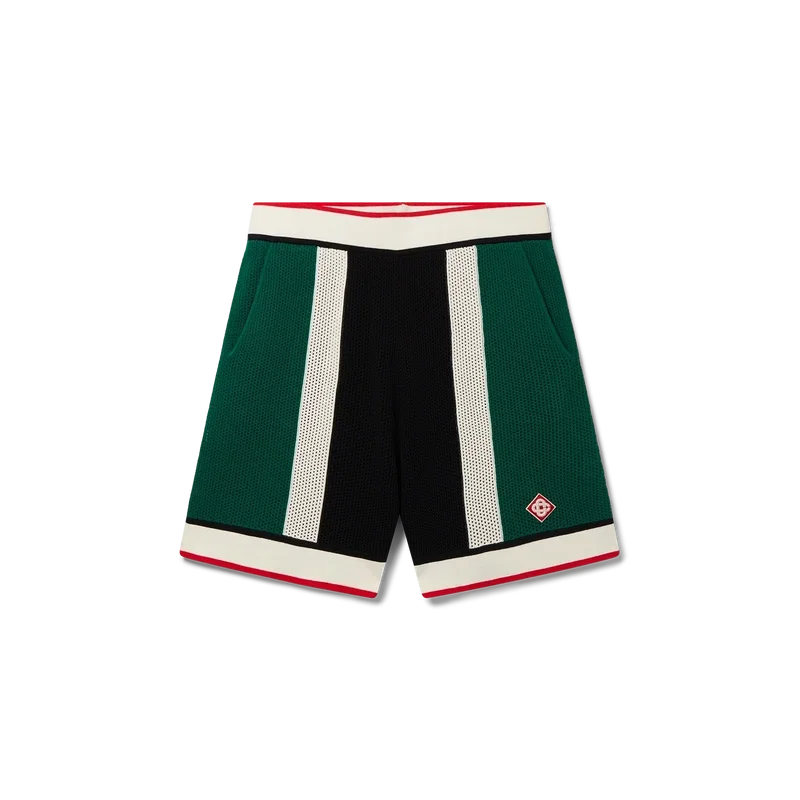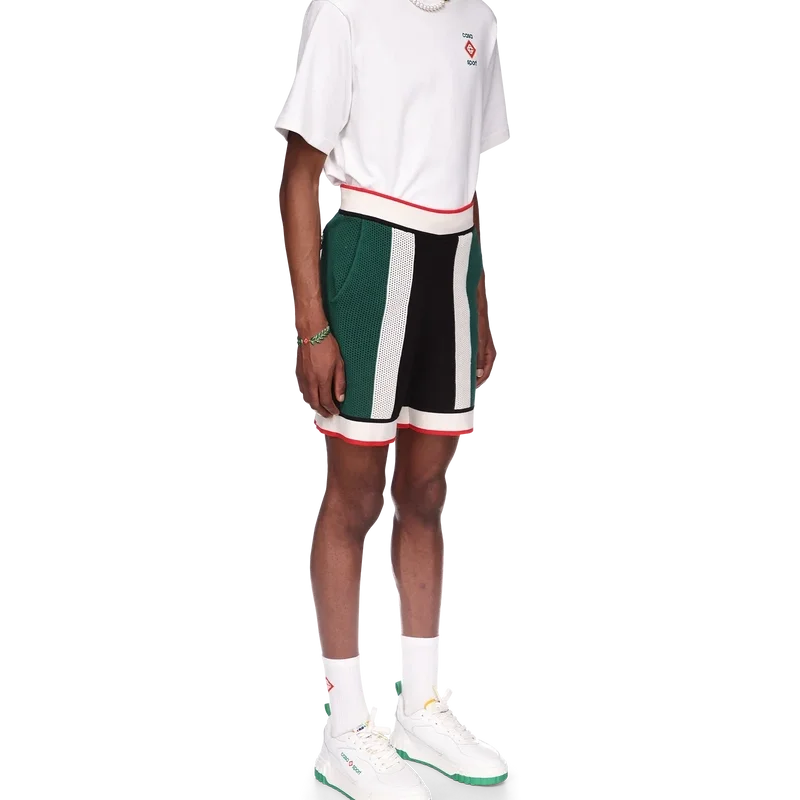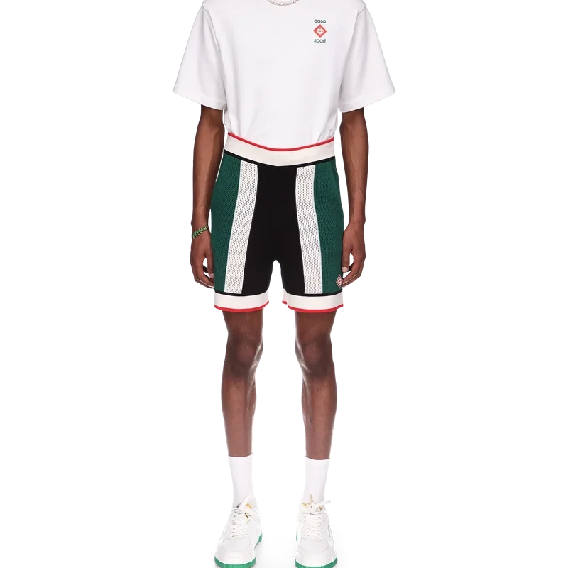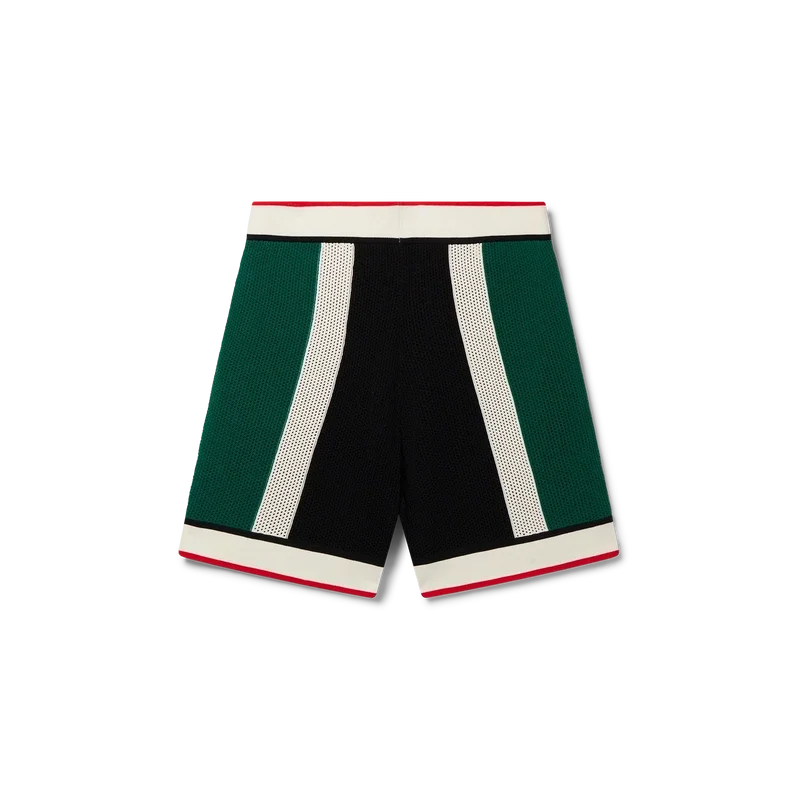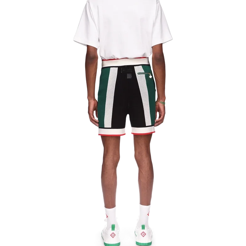 De gestreepte mesh-short is gemaakt van gebreide biologische katoen, geïnspireerd op de kleuren van de Nigeriaanse vlag en voorzien van het diamantlogo van het huis. Afgewerkt met een geribde tailleband en zoom, schuine zijzakken en een achterzak met ritssluiting.