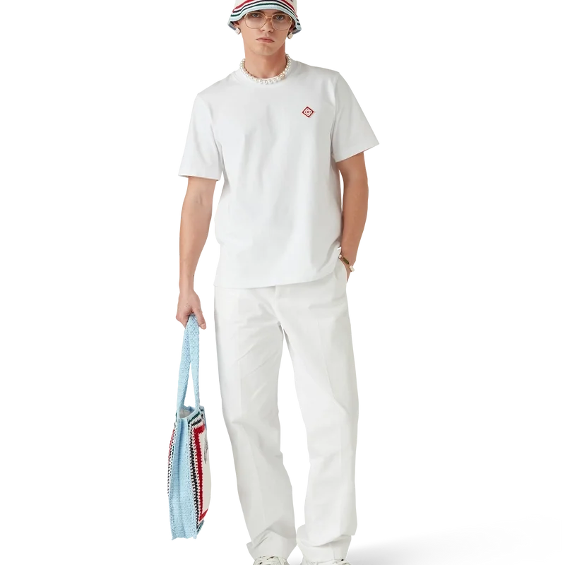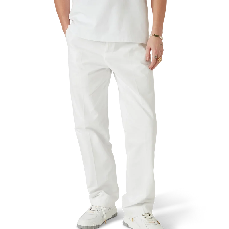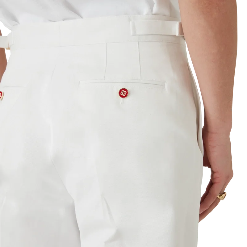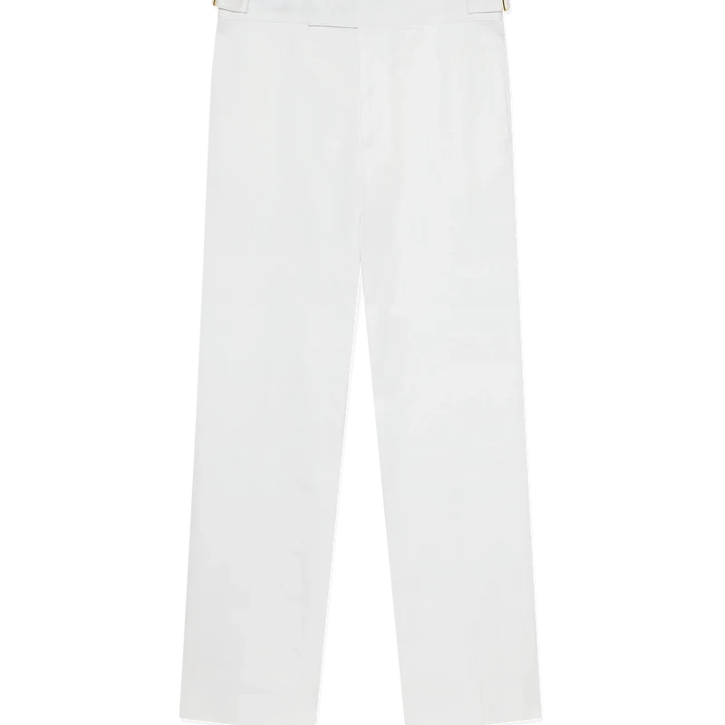 De getailleerde chino broek heeft een rechte pijp, is gemaakt van katoen en heeft een katoenen voering. Afgewerkt met steekzakken, een ritssluiting, verstelbanden aan de zijkant met vergulde gespen en paspelzakken aan de achterkant met knoopsluiting.