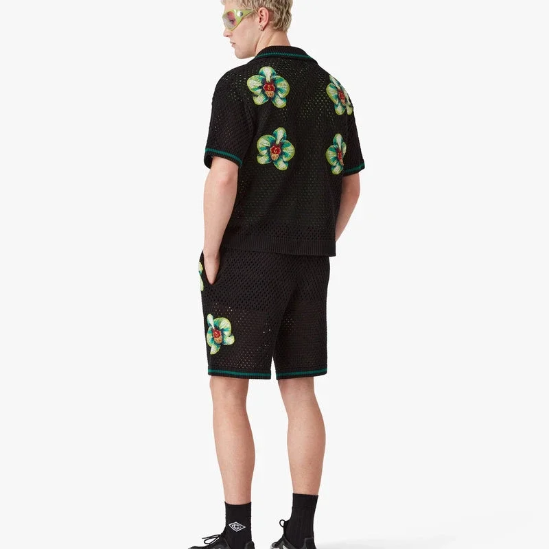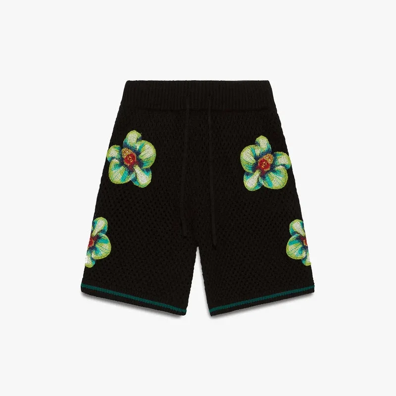 De Glitch Orchid geborduurde gehaakte Shorts heeft een verfijnd ontwerp met kunstwerk dat de contrasterende ontwerpfilosofie weergeeft van het samengaan van natuur en mens, in harmonie met elkaar, door de natuurlijke schoonheid van de orchideebloem te tonen. Afgewerkt met een elastische tailleband, trekkoordsluiting en geribbelde zoom.