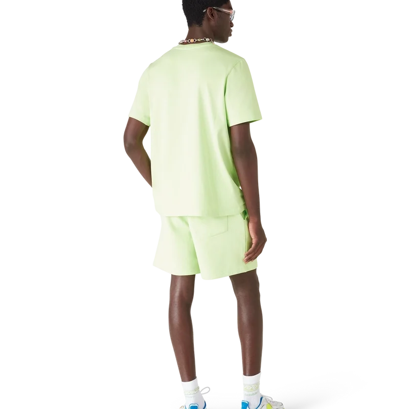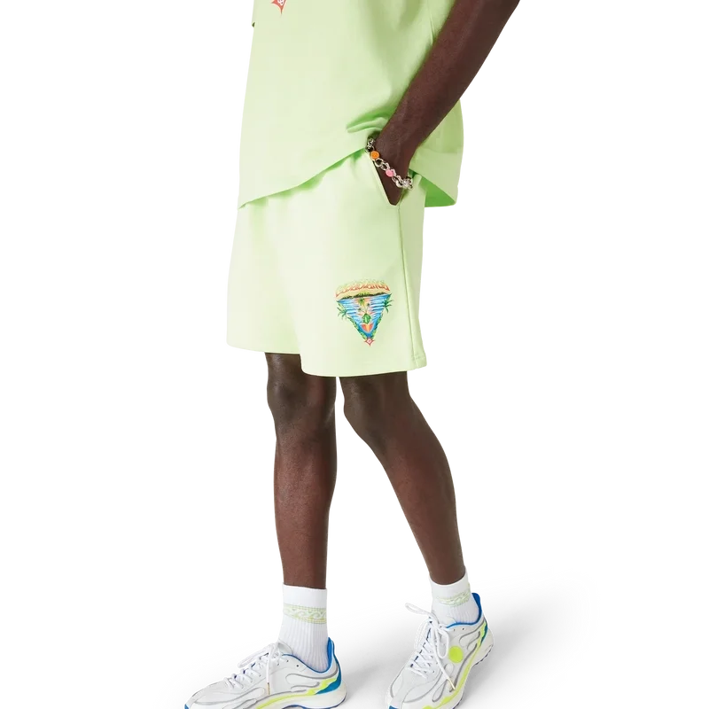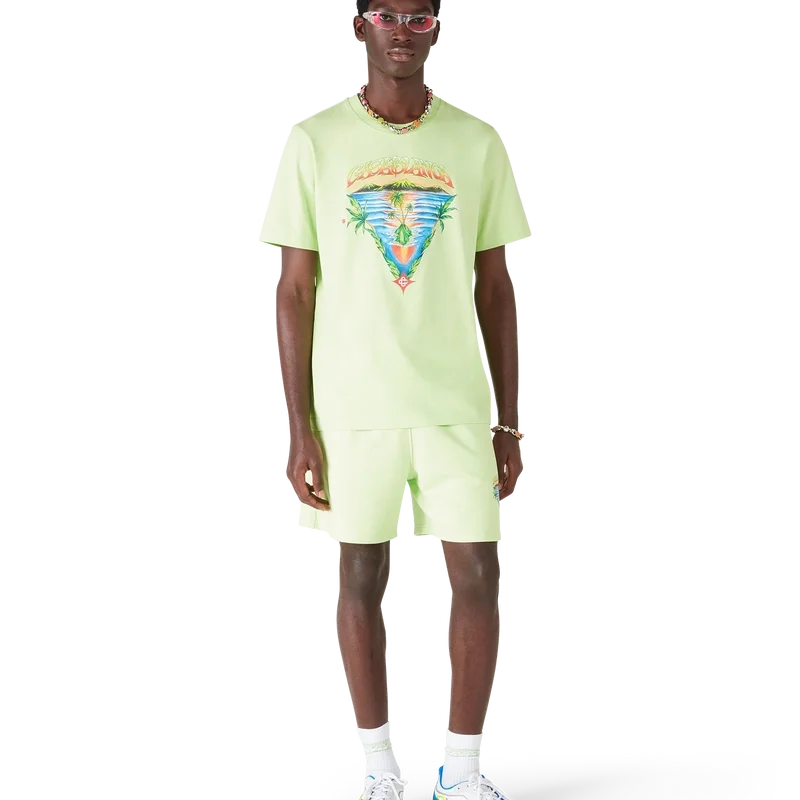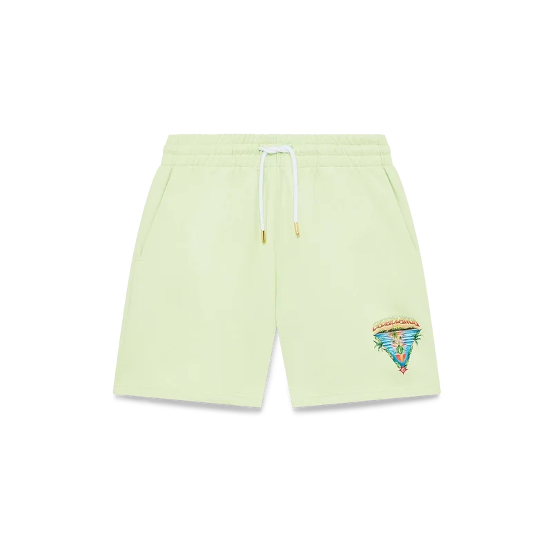De Innocence Triangle Sweatshort is een verfijnd ontwerp met een oceaanscène bij zonsondergang en een eiland in het midden, weergegeven in een stijl die is beïnvloed door klassieke surf-T-shirtkunst. Het kunstwerk legt de etherische schoonheid van het gouden uur boven tropische wateren vast en presenteert een geïdealiseerd beeld van een strandparadijs door de verfijnde sport- en vrijetijdsbril van het huis.