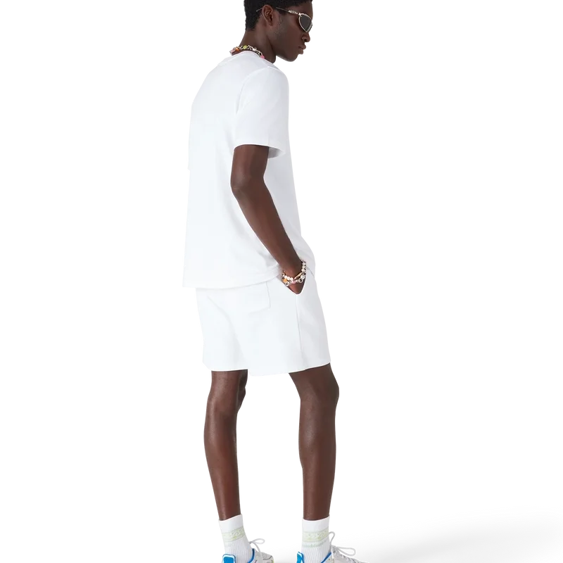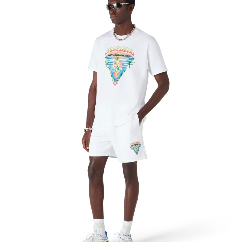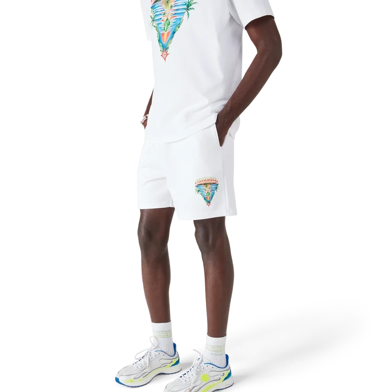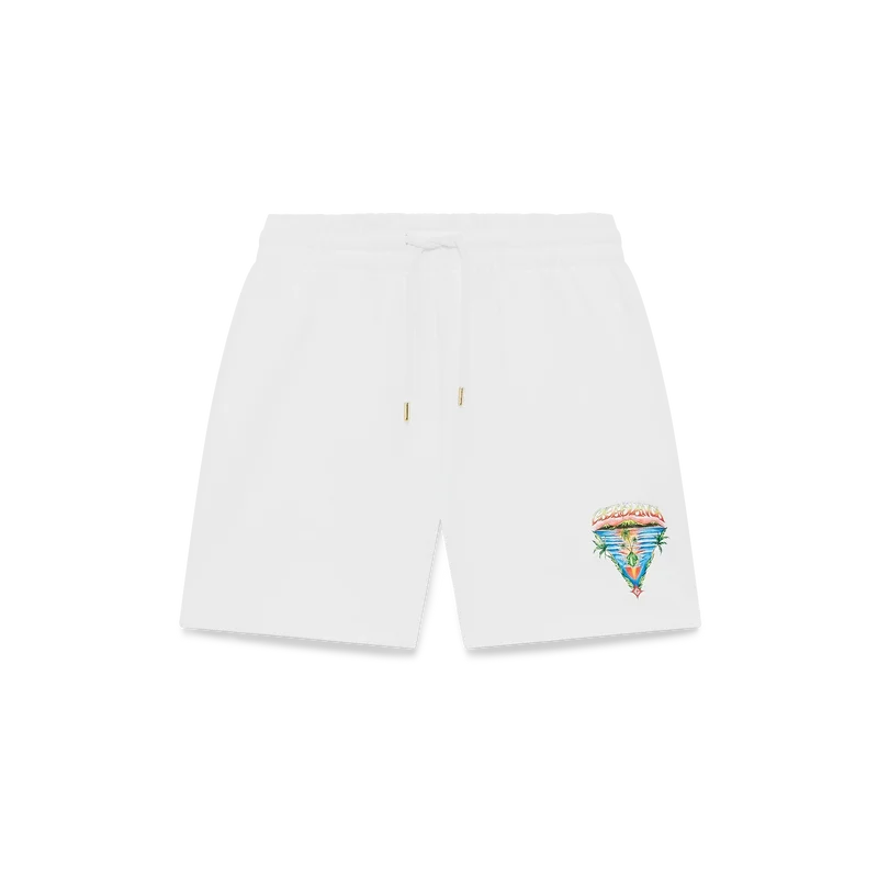 De Innocence Triangle Sweatshort is een verfijnd ontwerp met een oceaanscène bij zonsondergang met een eiland in het midden, weergegeven in een stijl die is beïnvloed door klassieke surf-T-shirtkunst. Het kunstwerk legt de etherische schoonheid van het gouden uur boven tropische wateren vast en presenteert een geïdealiseerd beeld van een strandparadijs door de verfijnde sport- en vrijetijdsbril van het huis.