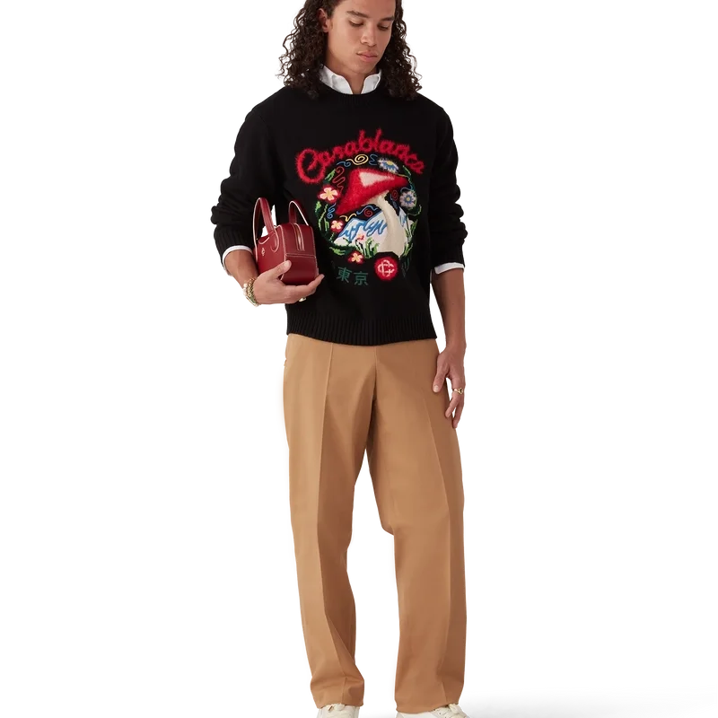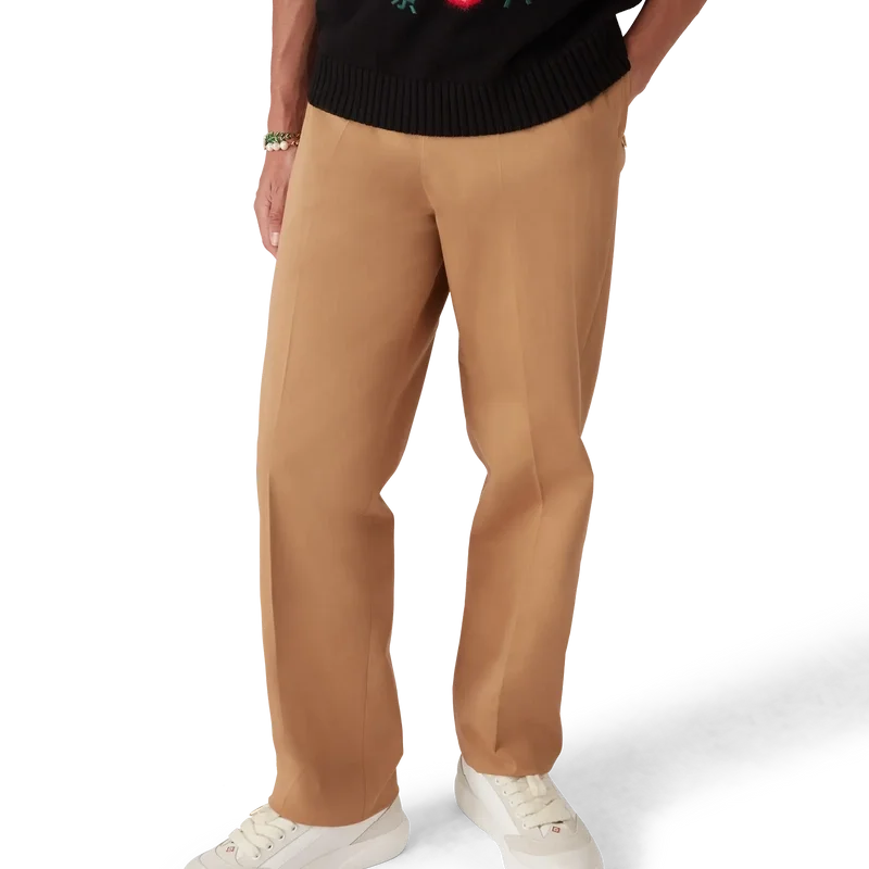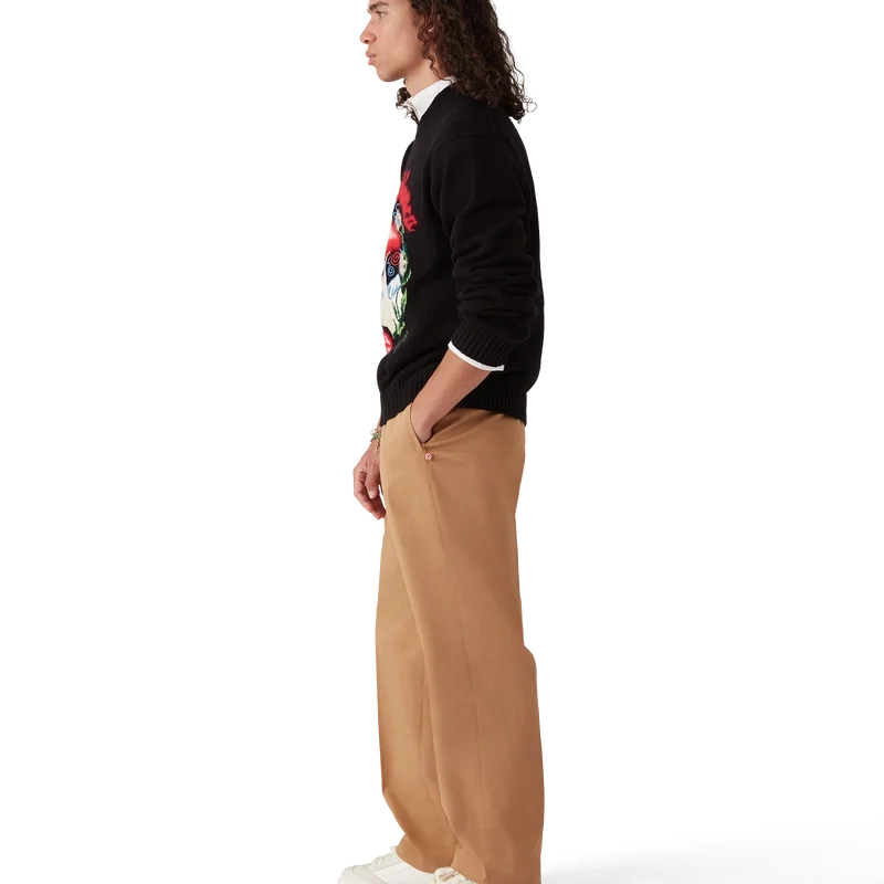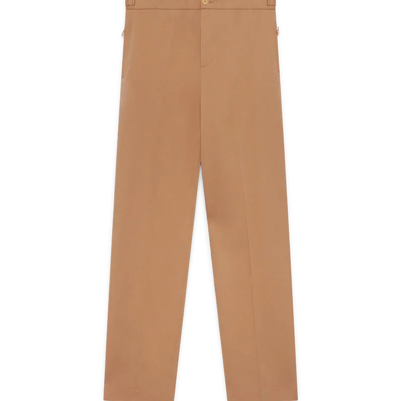De broek heeft een rechte pijp en is gemaakt van biologisch katoen. Afgewerkt met een katoenen voering, paspelzakken in de zijnaad met ritssluiting voorzien van de kenmerkende ritslipjes met het diamantlogo van het huis, ritssluiting, verstelbandjes aan de zijkant en paspelzakken aan de achterkant.