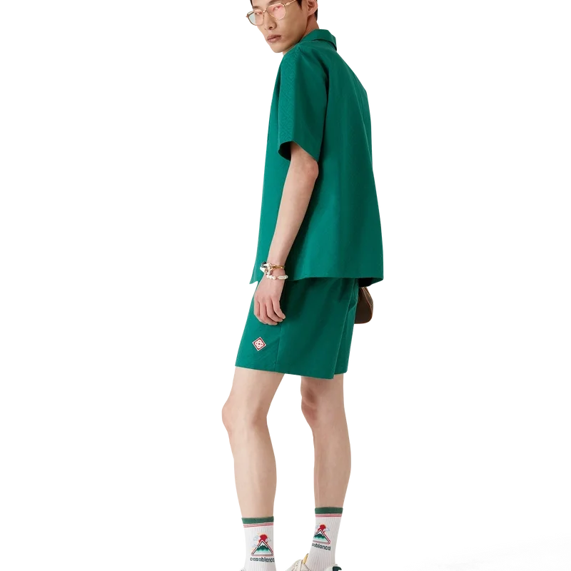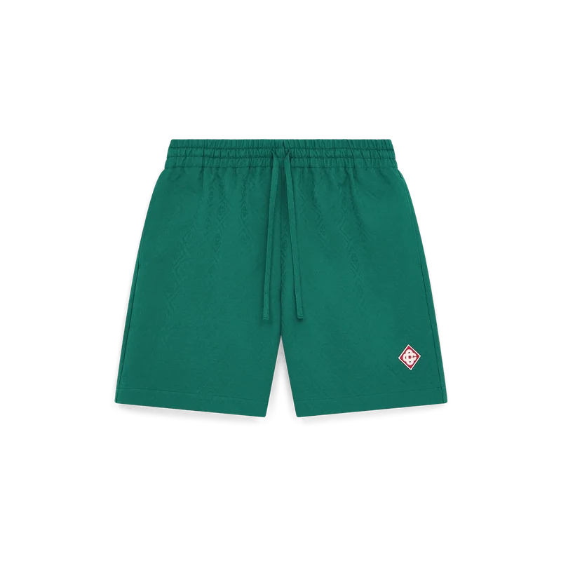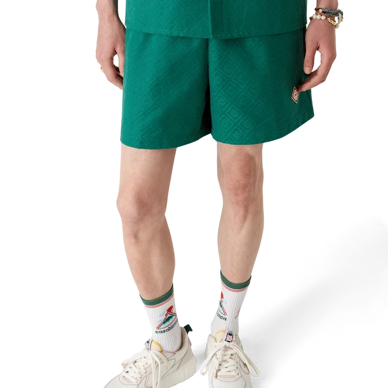 De katoenen Monogram Jacquard-Shorts is een klassiek ontwerp, vervaardigd uit een Monogram katoenen jacquardstof. Afgewerkt met een elastische tailleband, een trekkoord met gouden uiteinden, een achterzak en zijzakken in de naad.