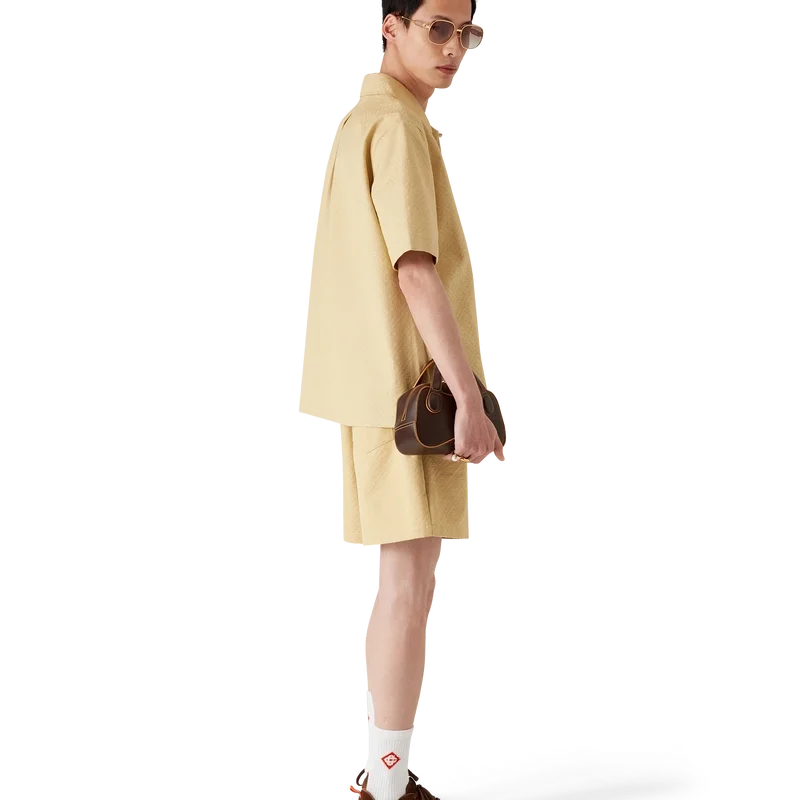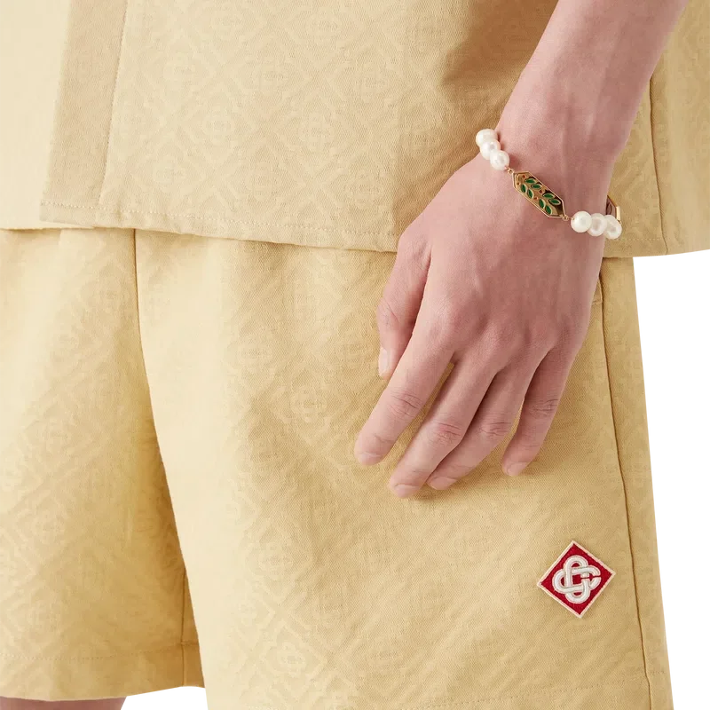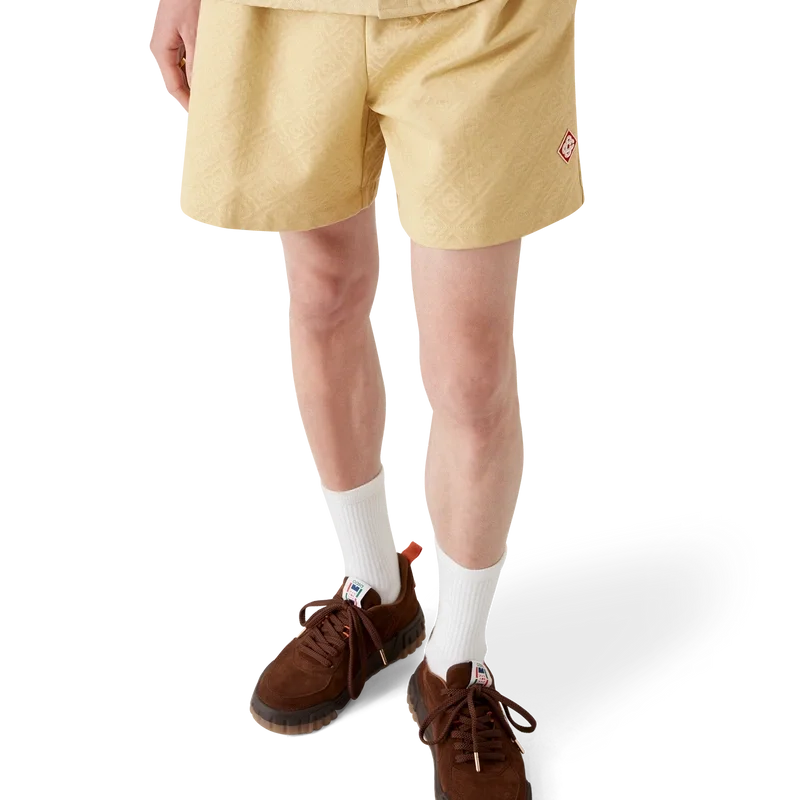 De jacquard monogram shorts hebben een klassiek ontwerp en zijn gemaakt van een monogram katoen jacquard stof. Afgewerkt met een elastische tailleband, een trekkoord met gouden uiteinden, een achterzak en steekzakken aan de zijkanten. Beige
