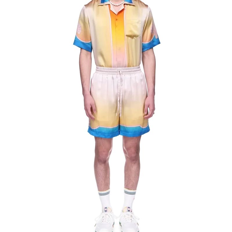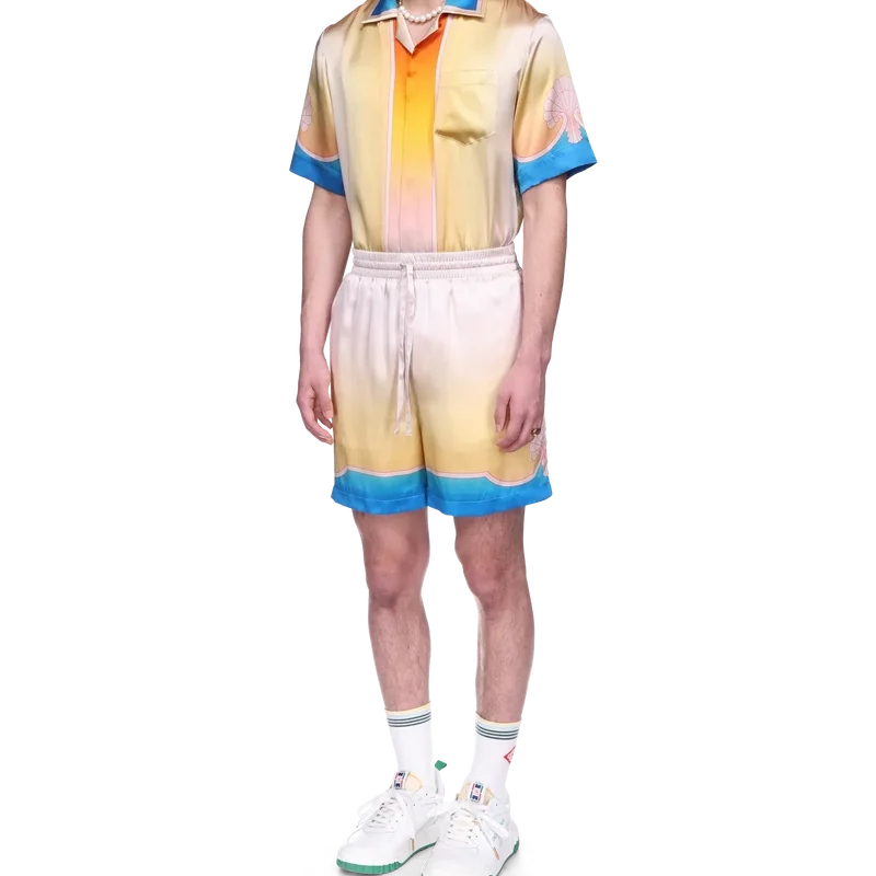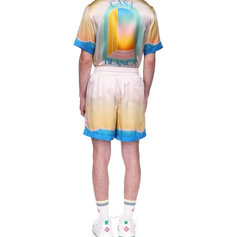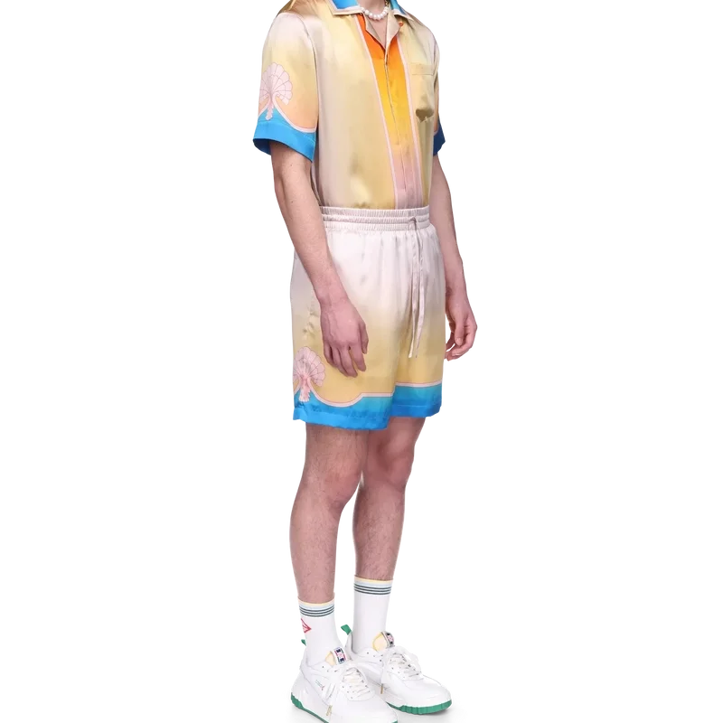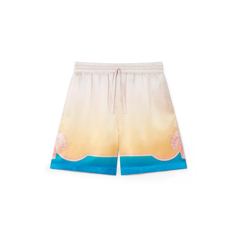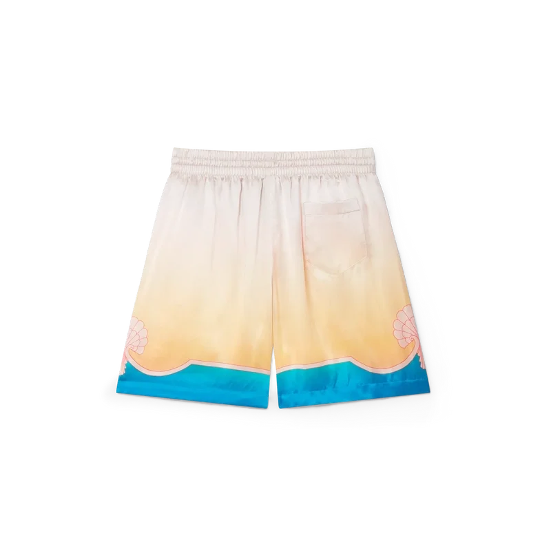 De L’arc Colora zijden Shorts zijn een bekend ontwerp, vervaardigd van bedrukt zijdesatijn en voorzien van de kenmerkende kleurverloopprint en schelpmotieven van het huis. Het kleurenpalet voor deze collectie is licht en idealistisch, en benadrukt de etherische thema’s die centraal staan in ons merk. Afgewerkt met gestreepte randdetails die overgaan in schelpmotieven aan de zoom, een elastische tailleband met trekkoordsluiting, zijzakken en een achterzak.