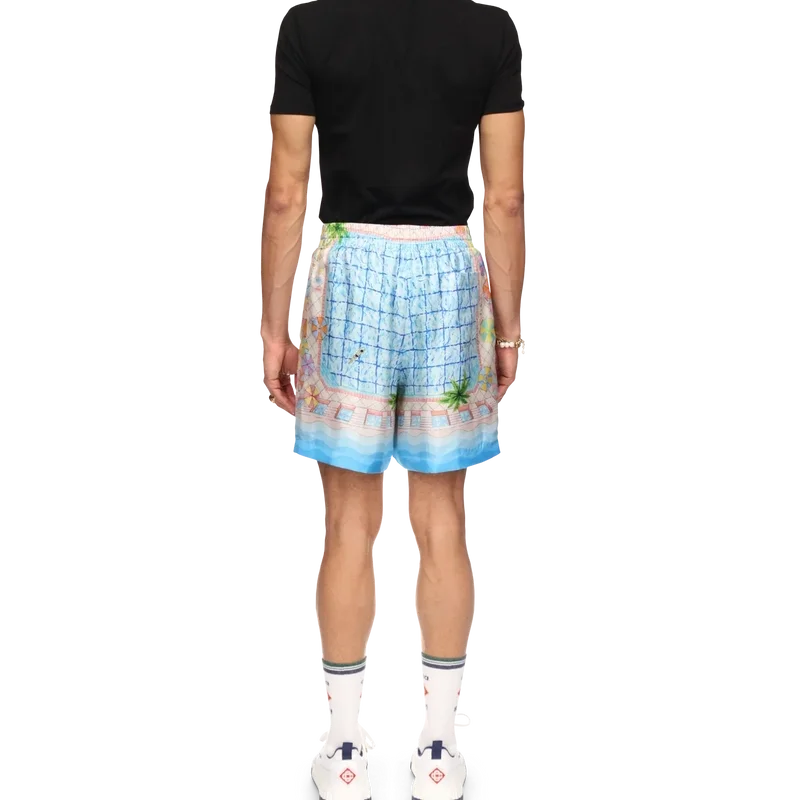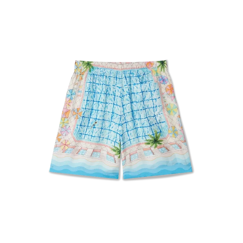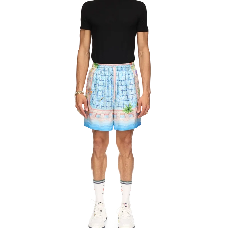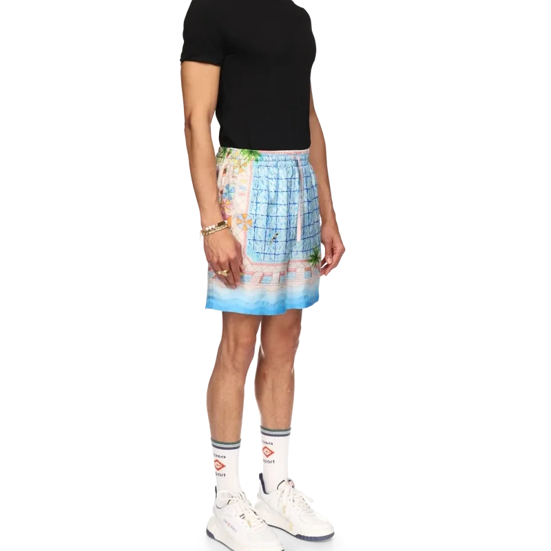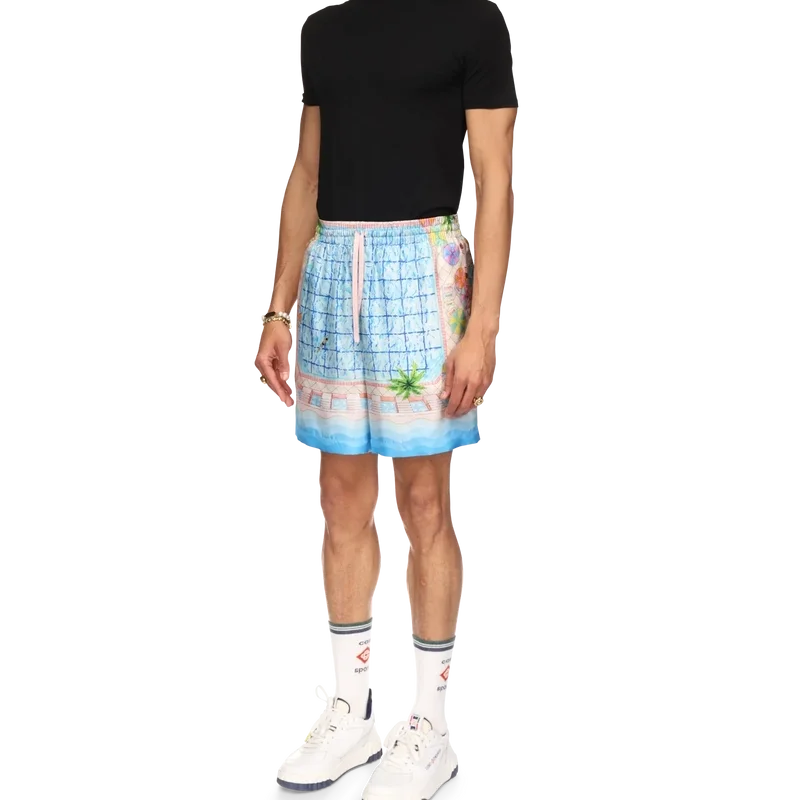 De Le Plongeon zijden Shorts hebben een vertrouwd ontwerp, zijn gemaakt van bedrukte zijden twill en zijn voorzien van seizoensgebonden kunstwerken geïnspireerd op een prachtige dag bij het zwembad van het hotel en reisidealisme gezien vanuit de lucht – wat een nieuw perspectief biedt. Het kleurenpalet is licht en idealistisch, bestaande uit zachte pastelkleuren. Afgewerkt met een elastische tailleband met trekkoordsluiting, zijzakken, een achterzak en contrasterende, op de Memphis-golf geïnspireerde details met kleurverloopstrepen aan de zoom.