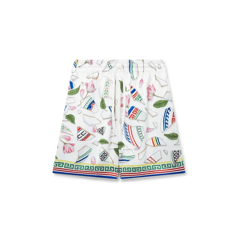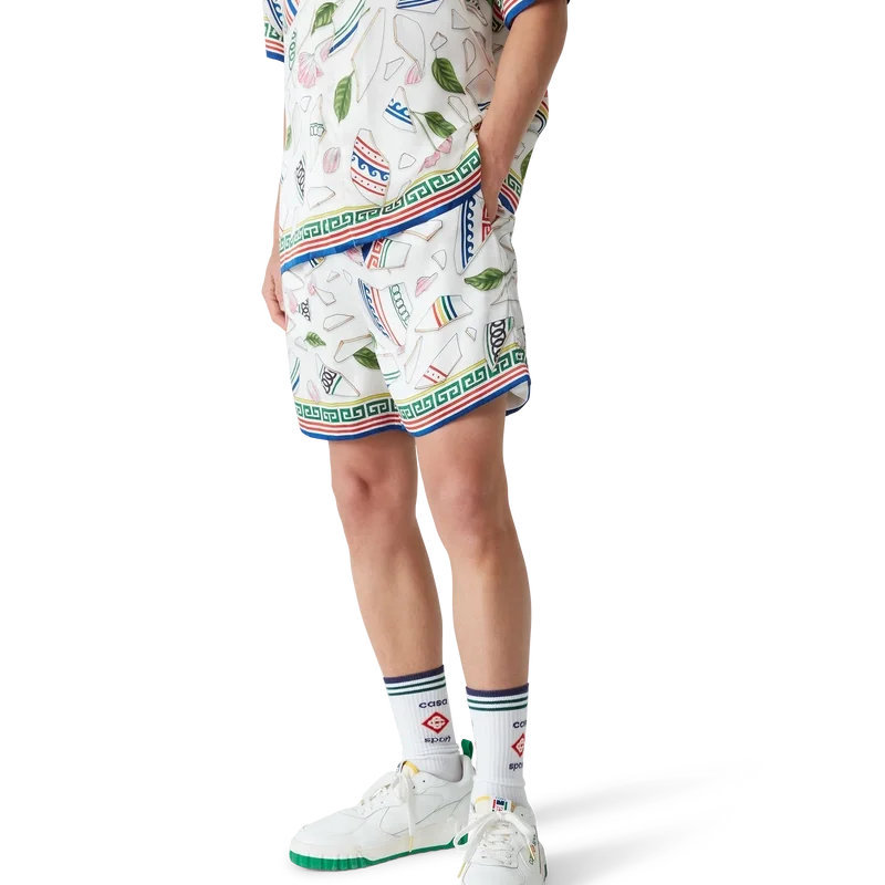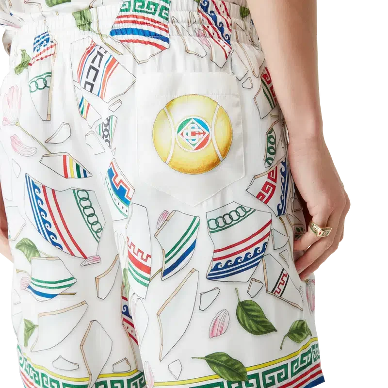 De Le Vase Brise zijden Short heeft een all-over print en is gemaakt van zijden satijn met het seizoensgebonden kunstwerk van het huis, dat herhalingen van stukjes van een gebroken vaas weergeeft. Afgewerkt met een elastische tailleband, steekzakken, een opgestikte achterzak, een trekkoordsluiting en een op Griekse sleutels geïnspireerd detail aan de zoom.