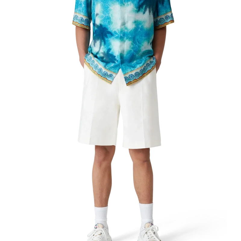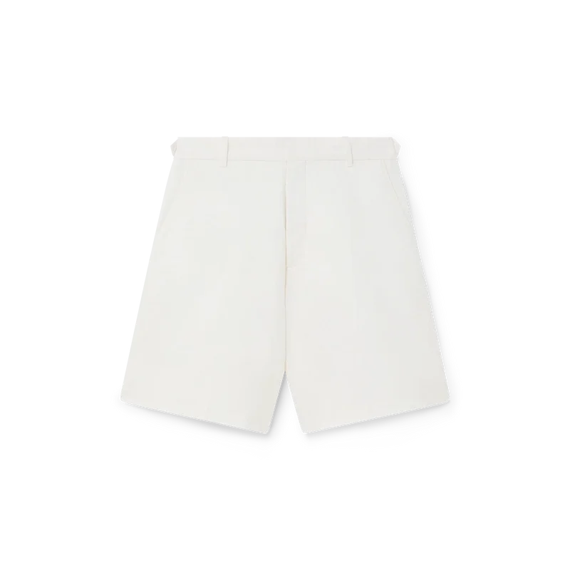 De linnen plooibroek heeft een getailleerd ontwerp en is gemaakt van een katoenmix. Afgewerkt met ritssluiting, verstelbare tailleband met in elkaar grijpende corozo-knopen en riemlussen, schuine zijzakken en achterzakken met klep en knoopsluiting.