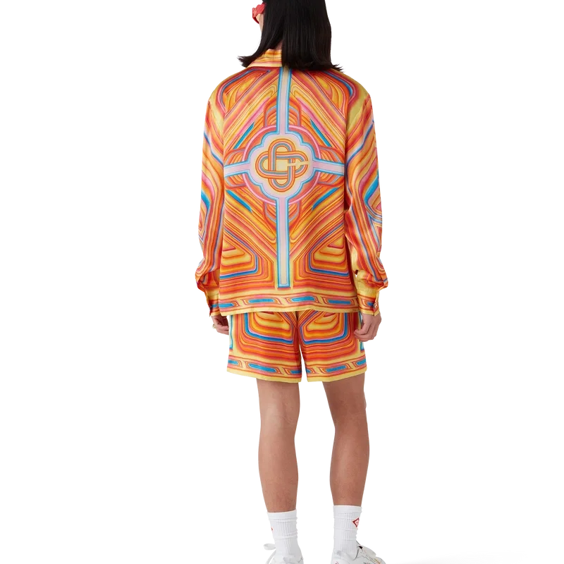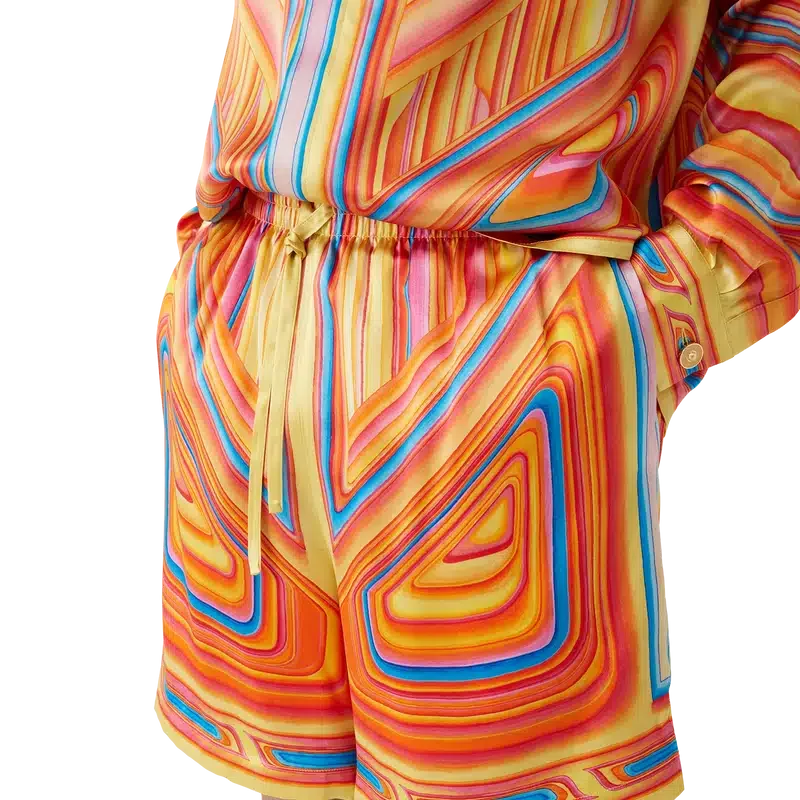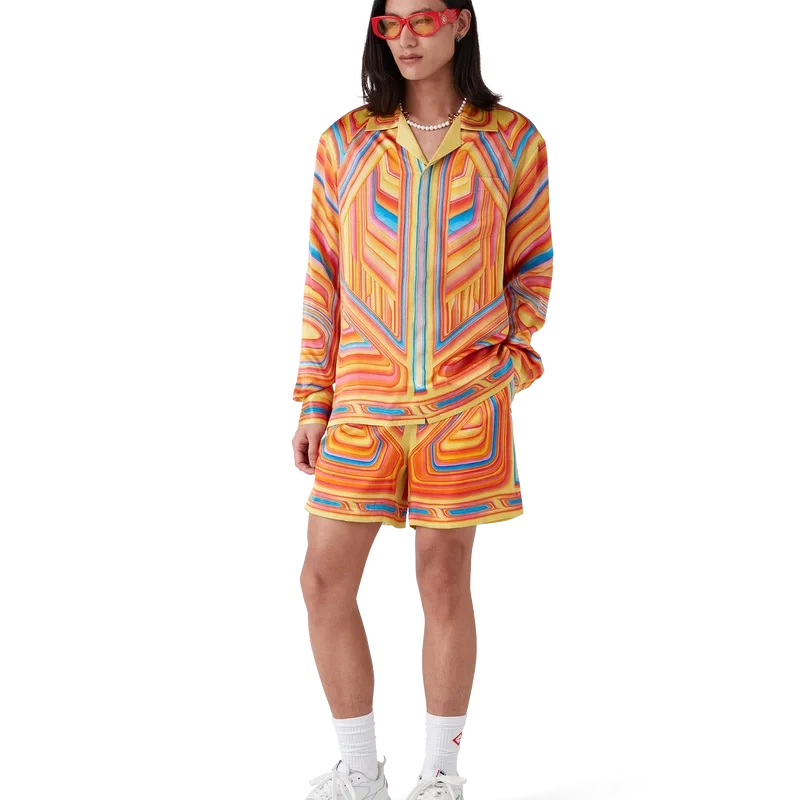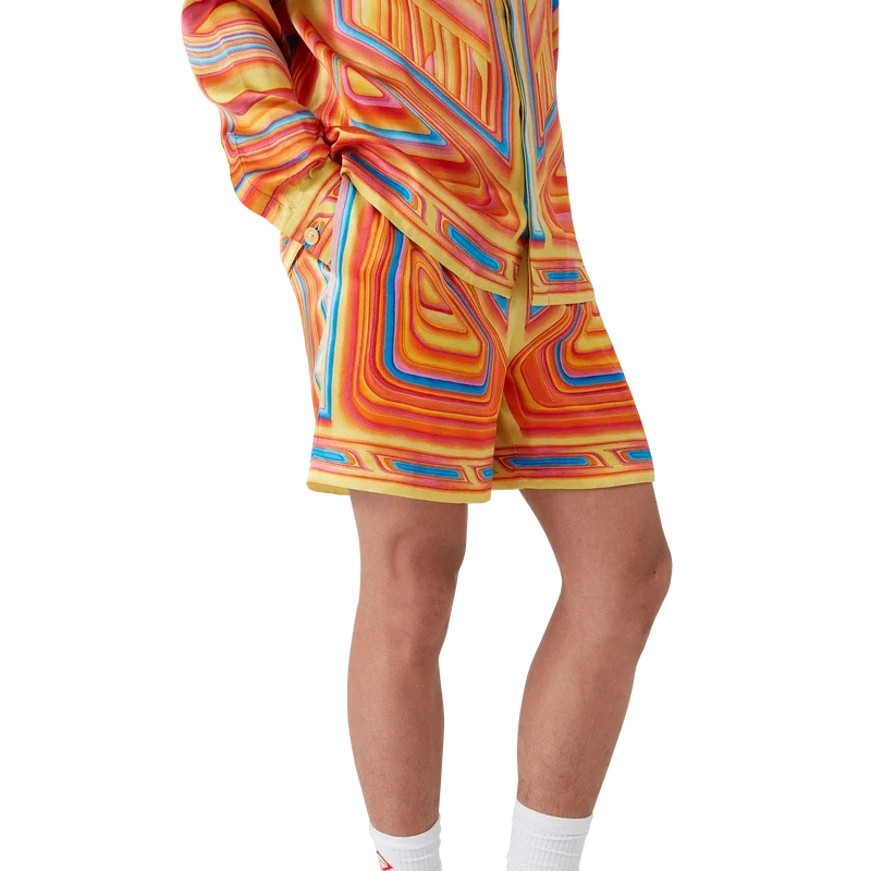 De Low Rider zijden short heeft een all-over print en is gemaakt van zijden satijn met het seizoensgebonden ontwerp van het huis, dat verwijst naar de popkleuren en airbrush-schildertechnieken die worden gebruikt op lowriders, met het Casablanca-logo. Afgewerkt met een elastische tailleband, steekzakken aan de zijkant, een opgestikte zak aan de achterkant, een trekkoordsluiting en een voering.