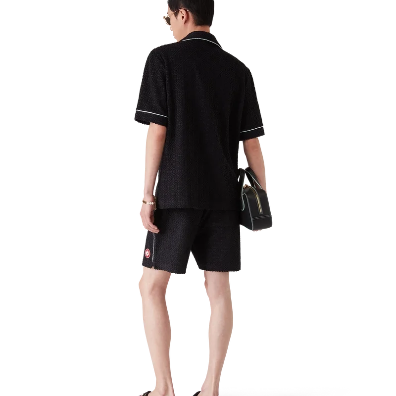 De Monogram badstofshorts zijn een klassiek ontwerp, vervaardigd uit Monogram badstof. Afgewerkt met een elastische tailleband, een trekkoord met gouden uiteinden, plooien aan de voorkant, een achterzak met ritssluiting, schuine zijzakken en biezen op de voor- en achterzakken en langs de zijkanten.