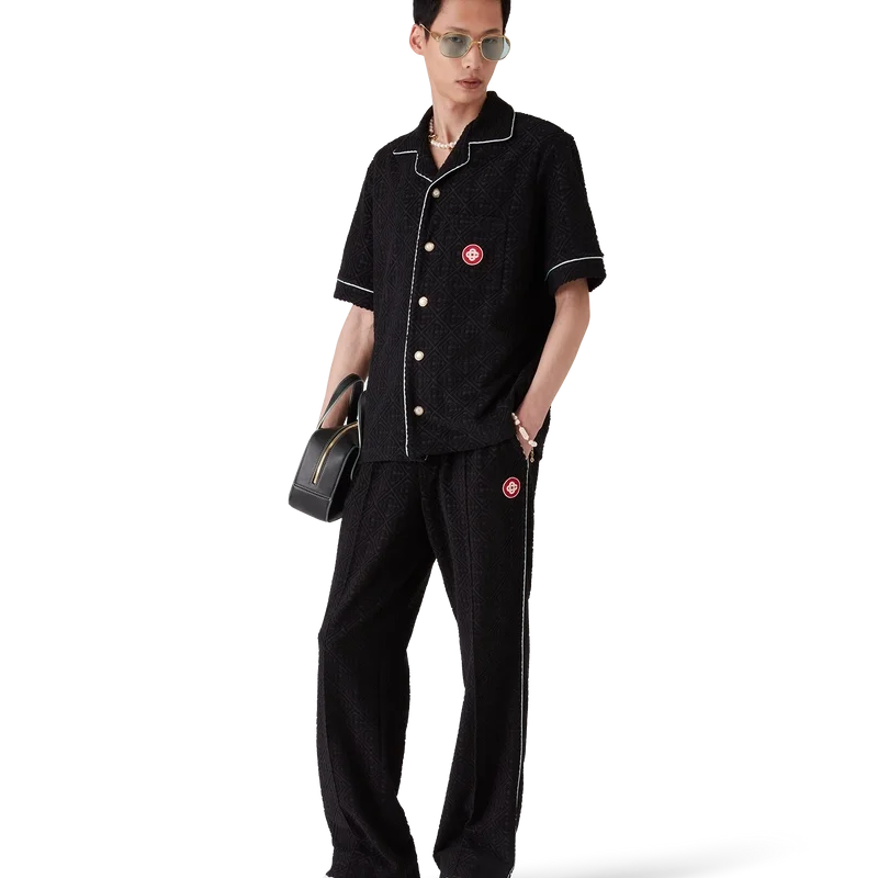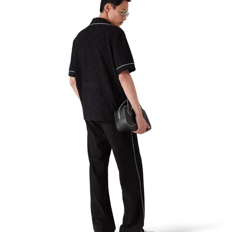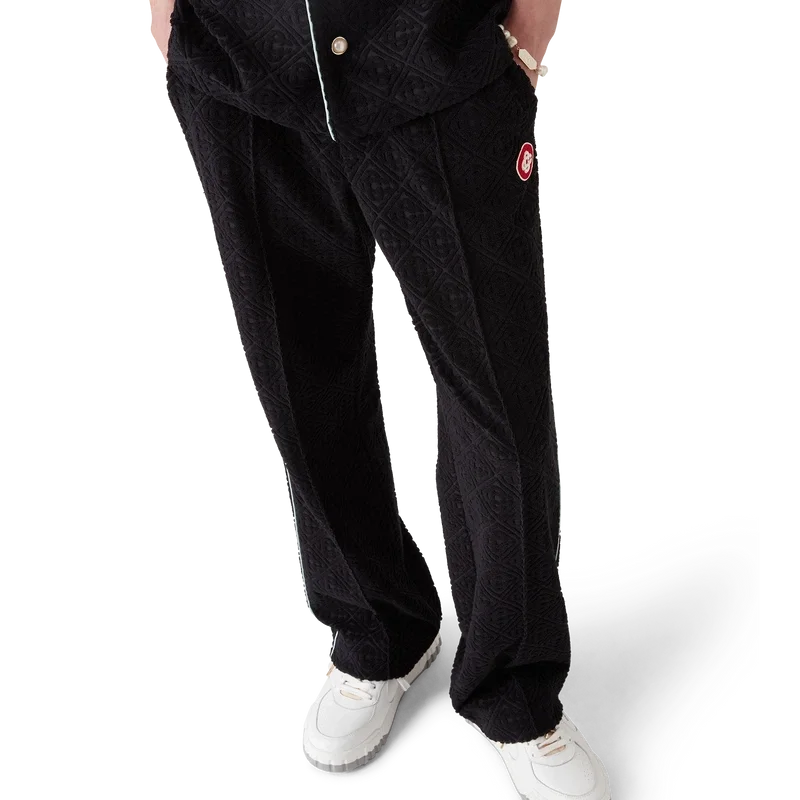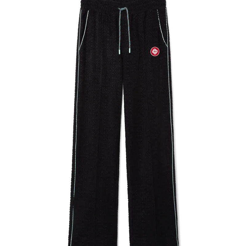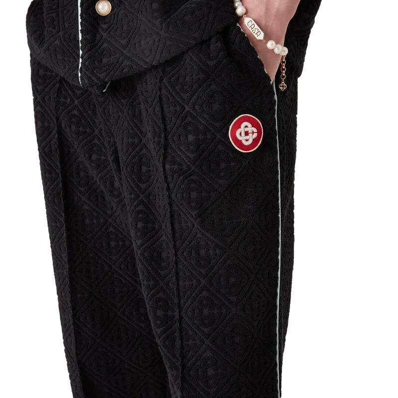 De Monogram Jacquard badstofbroek heeft een recht model en is gemaakt van badstof met het in elkaar grijpende CC-logo van het huis. Afgewerkt met een elastische tailleband, trekkoordsluiting, schuine zakken, plooien aan de voorkant, biezen op de zakken en langs de pijpen, en een opgestikte zak aan de achterkant.