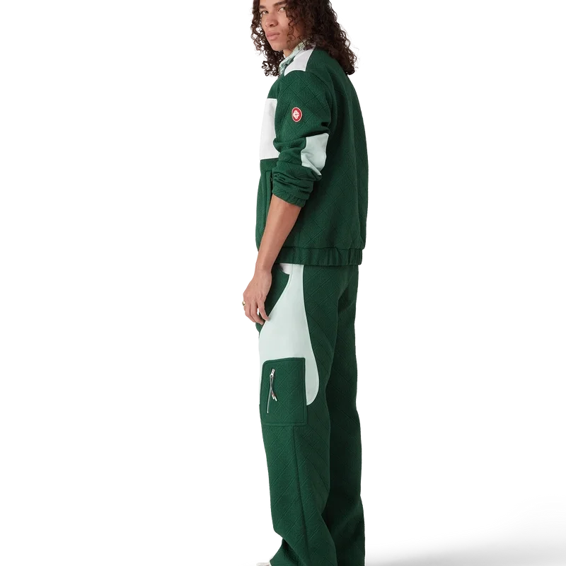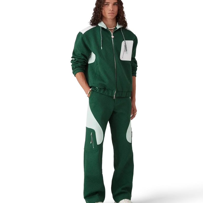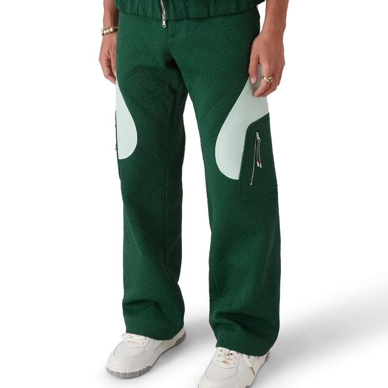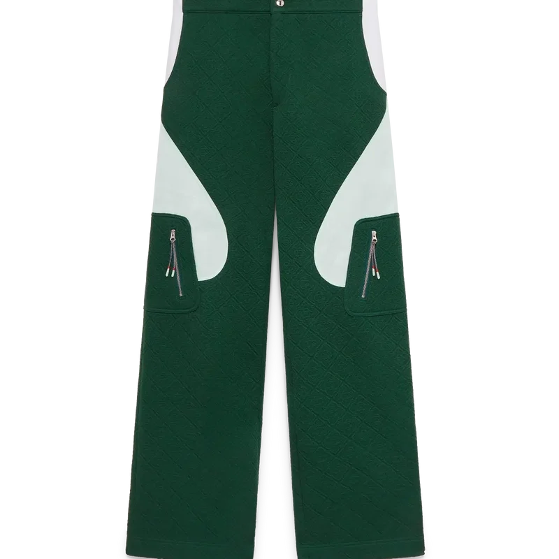 De Monogram Jacquard gebreide broek heeft een recht model met contrasterende kleurblokken. Afgewerkt met een tailleband met een vergulde drukknop met merknaam, een ritssluiting, contrasterende zijpanelen, schuine voorzakken en opgestikte zijzakken met verticale ritssluitingen en trekkoorden geïnspireerd op bergbeklimmerskoorden.