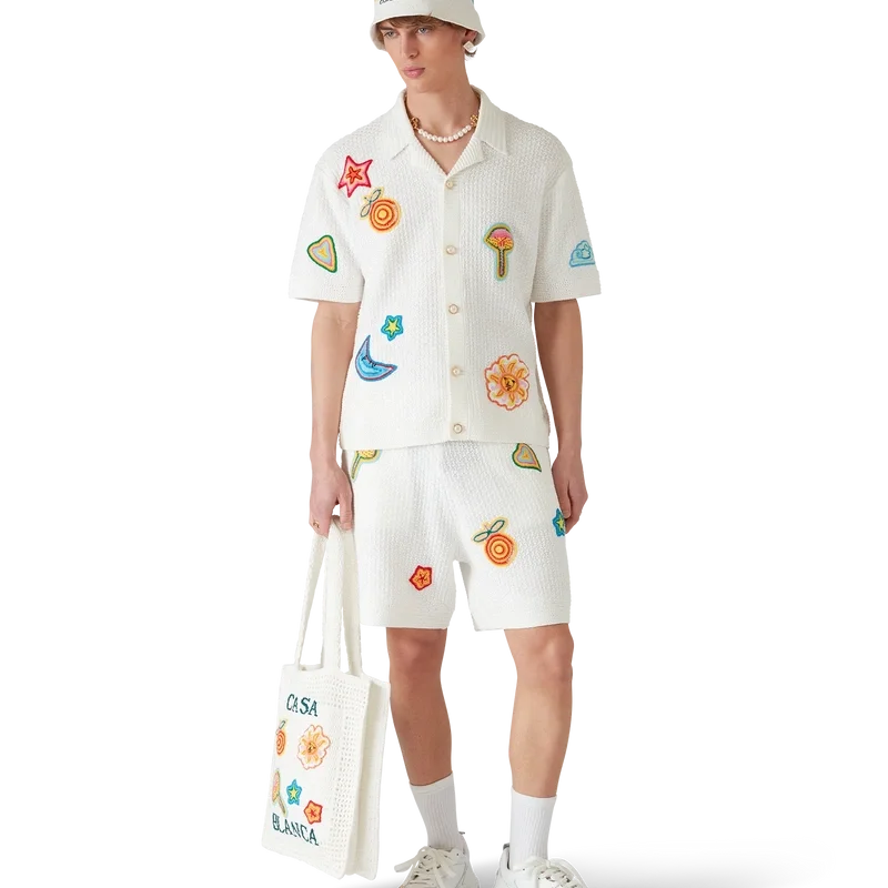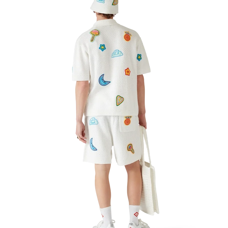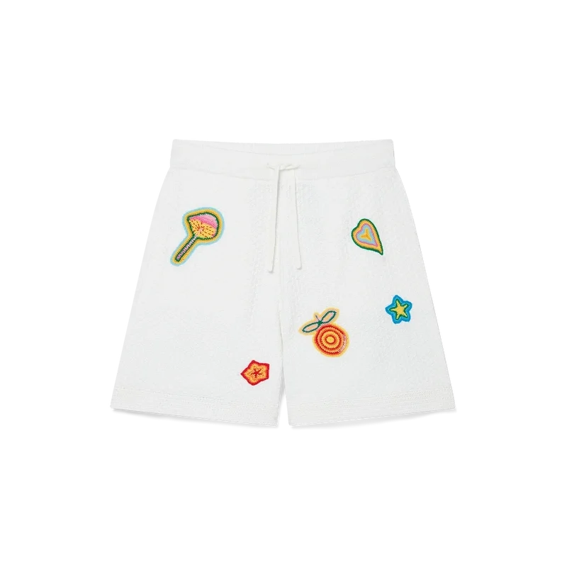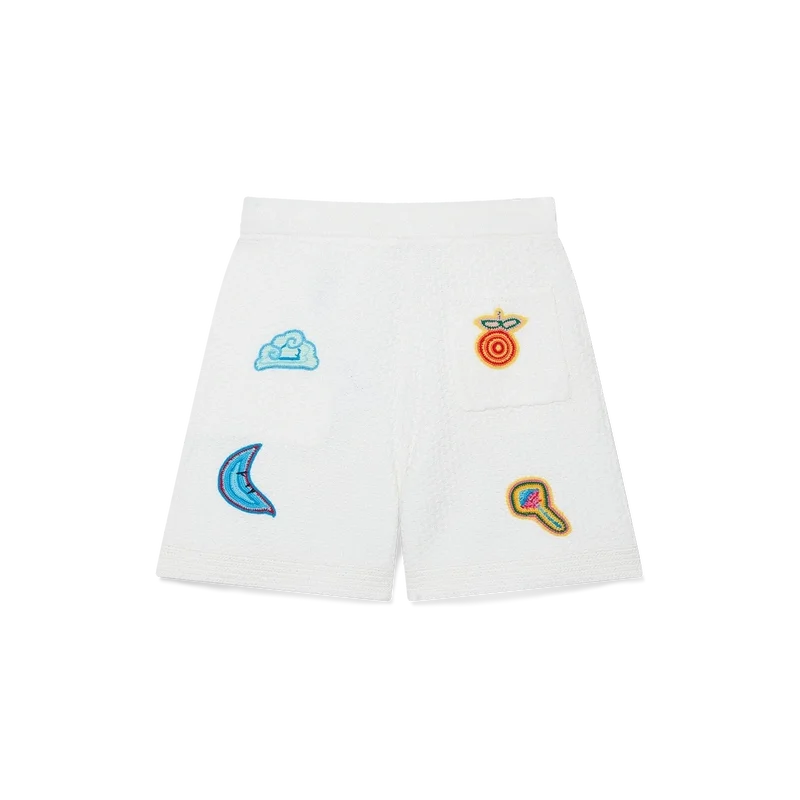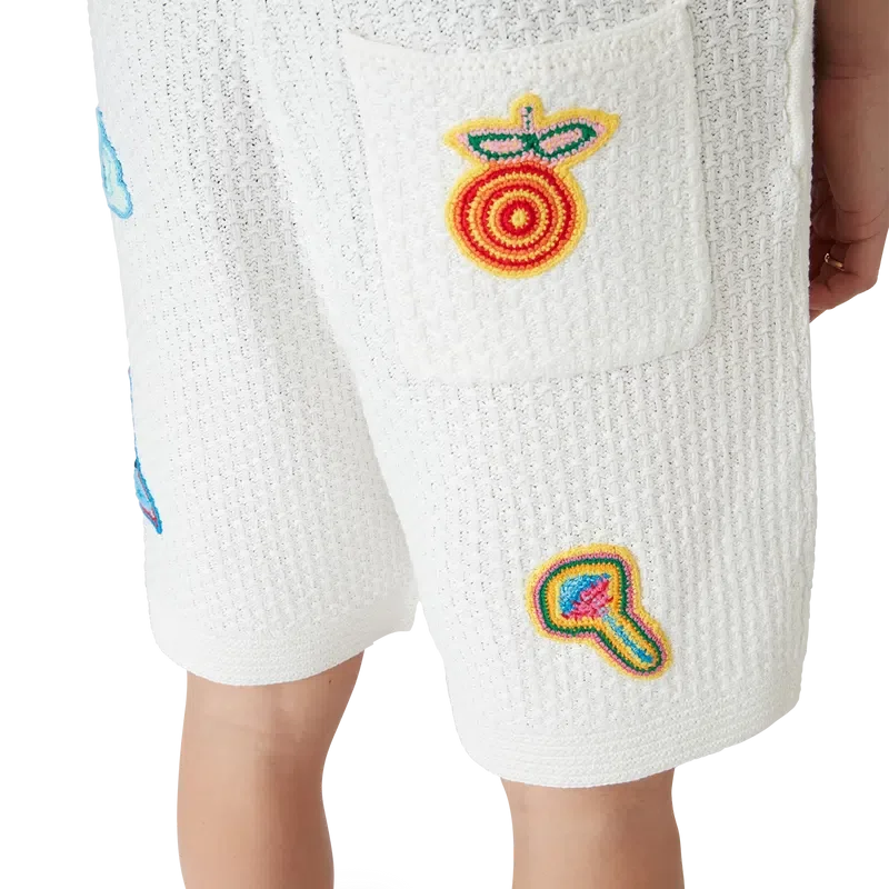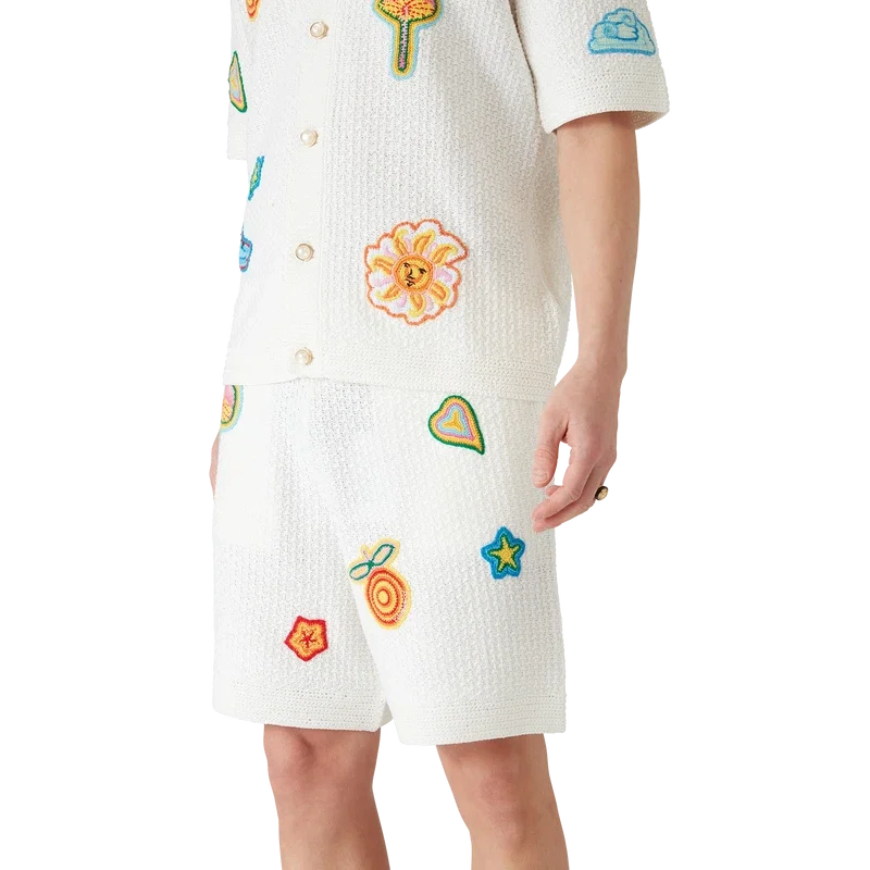 De gehaakte short met motief is een knielange short gemaakt van gemerceriseerd katoen met gehaakte motieven. Afgewerkt met motieven van de klassieke designelementen van het huis, een elastische tailleband, trekkoordsluiting en schuine zakken aan de voorkant.