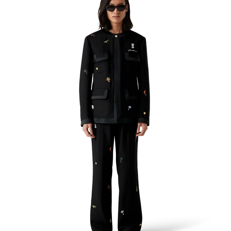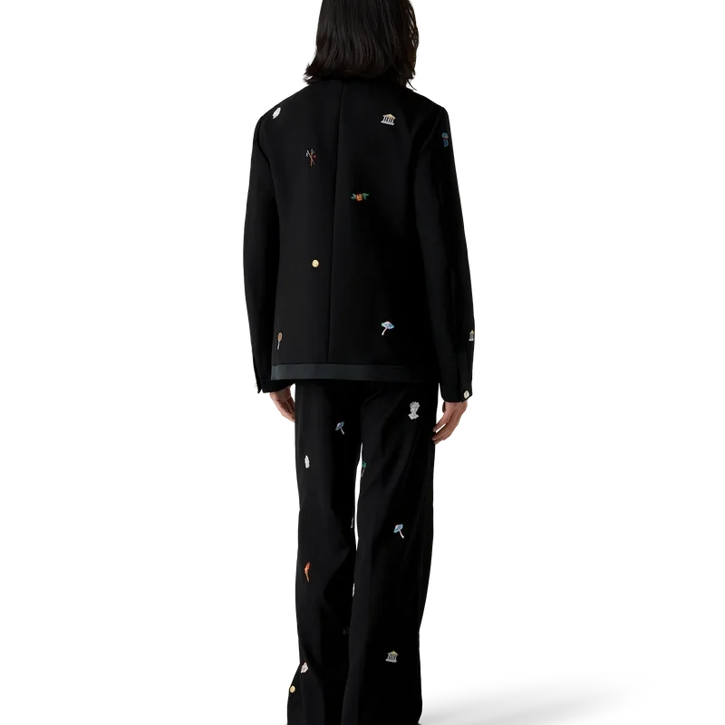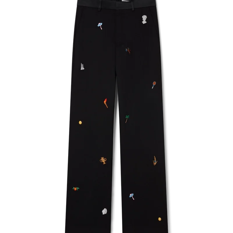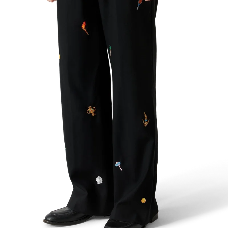 De geborduurde wollen broek met motief heeft een klassiek silhouet en is vervaardigd van geborduurde wol. Afgewerkt met geborduurde kunstwerken die de symboliek van het huis met de natuur en architectuur weergeven, schuine zijzakken, een voering, ritssluiting, riemlussen en achterzakken. Bedoeld om te worden gedragen met het bijpassende jasje.