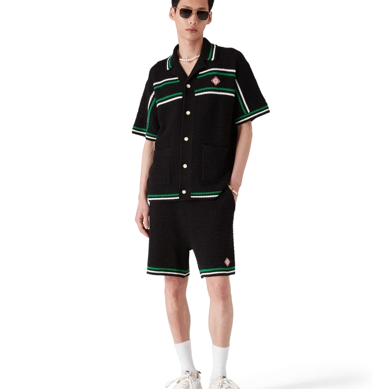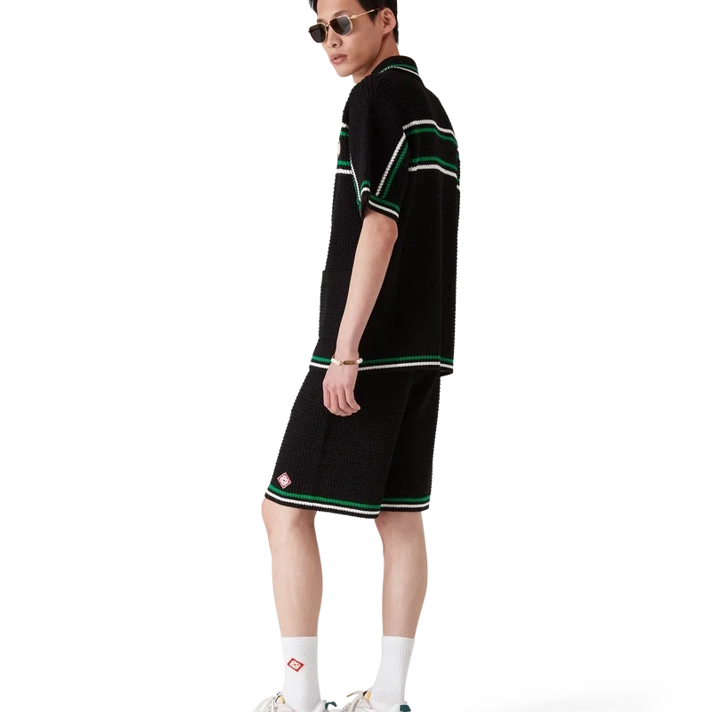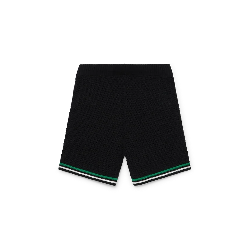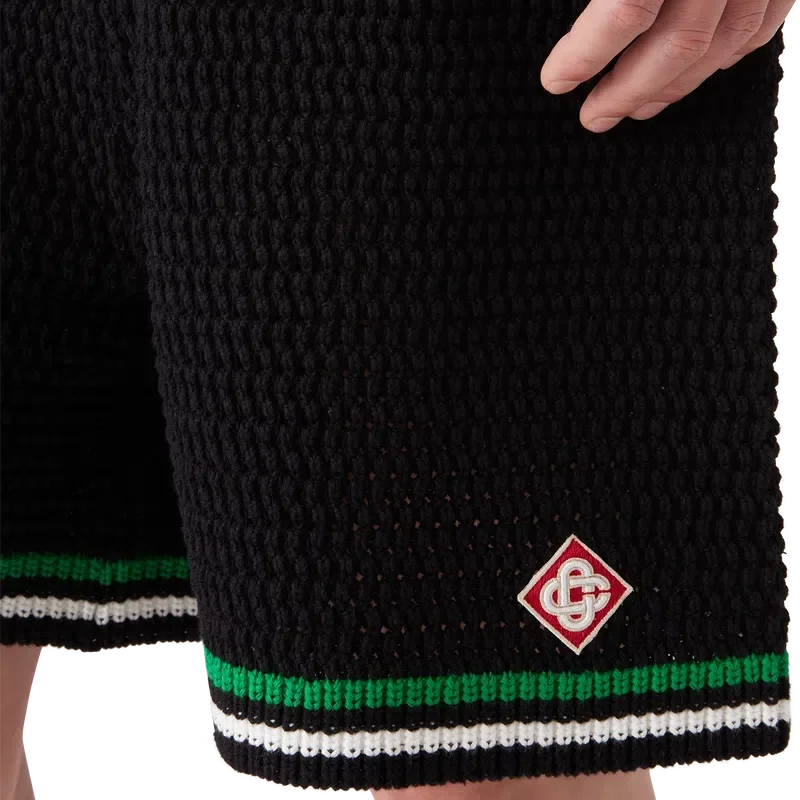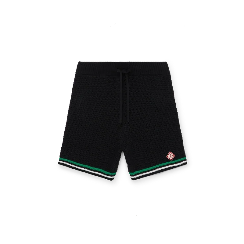 De Tennis Crochet Shorts zijn een zacht gestructureerd ontwerp, vervaardigd uit gebreide katoen, met het kenmerkende diamantlogo van het huis. Afgewerkt met een contrasterende witte geribde elastische tailleband, trekkoordsluiting en randdetails, en groen-witte streepjes op de zoom.