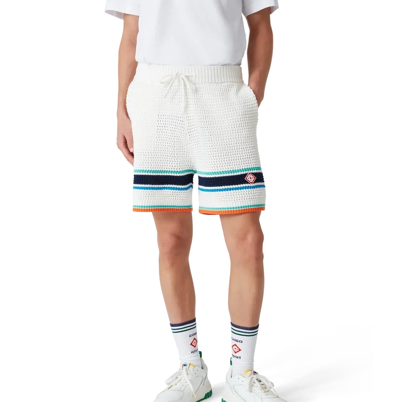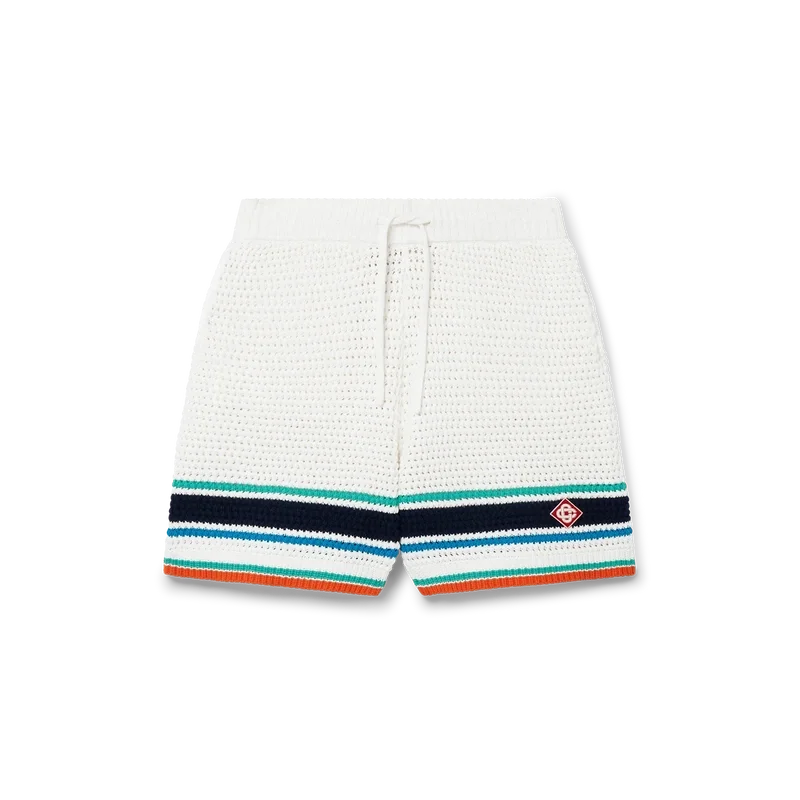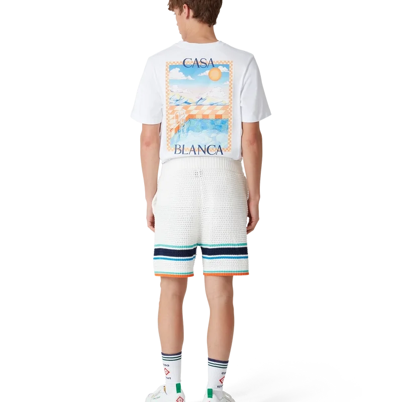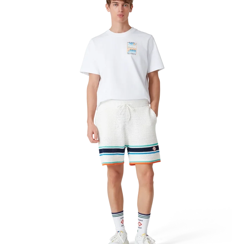 De Tennis Crochet Shorts zijn een zacht gestructureerd ontwerp, vervaardigd van gebreide biologische katoen, met het kenmerkende diamantlogo van het huis dat teruggrijpt op het reis- en vakantiethema van de capsulecollectie. Afgewerkt met een geribde elastische tailleband met trekkoordsluiting, zijzakken en contrasterende streepjes aan de zoom.