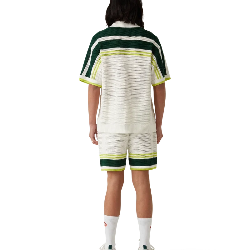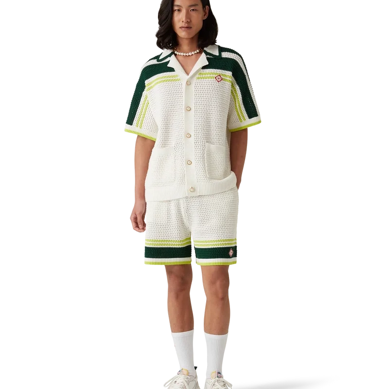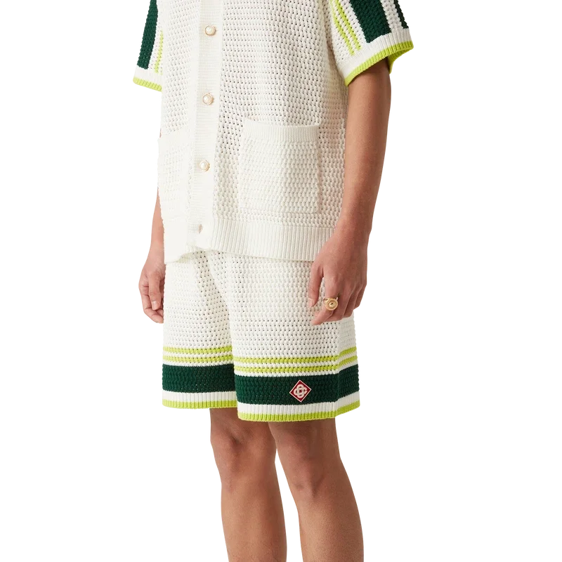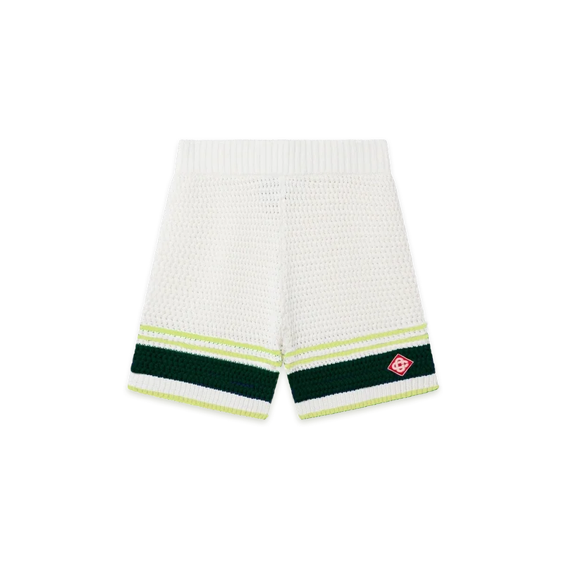 De Tennis Crochet Shorts zijn een zacht gestructureerd ontwerp, vervaardigd van gebreide katoenen stof, voorzien van het kenmerkende diamantlogo van het huis. Afgewerkt met een geribde elastische tailleband met trekkoordsluiting, zijzakken en contrasterende streepdetails op de pijpen.