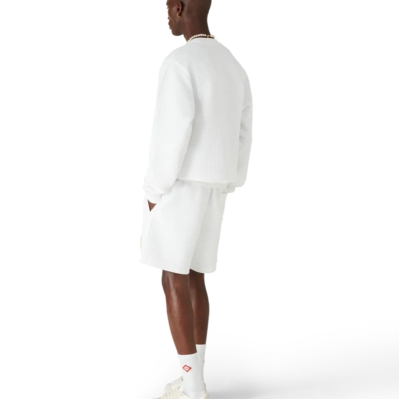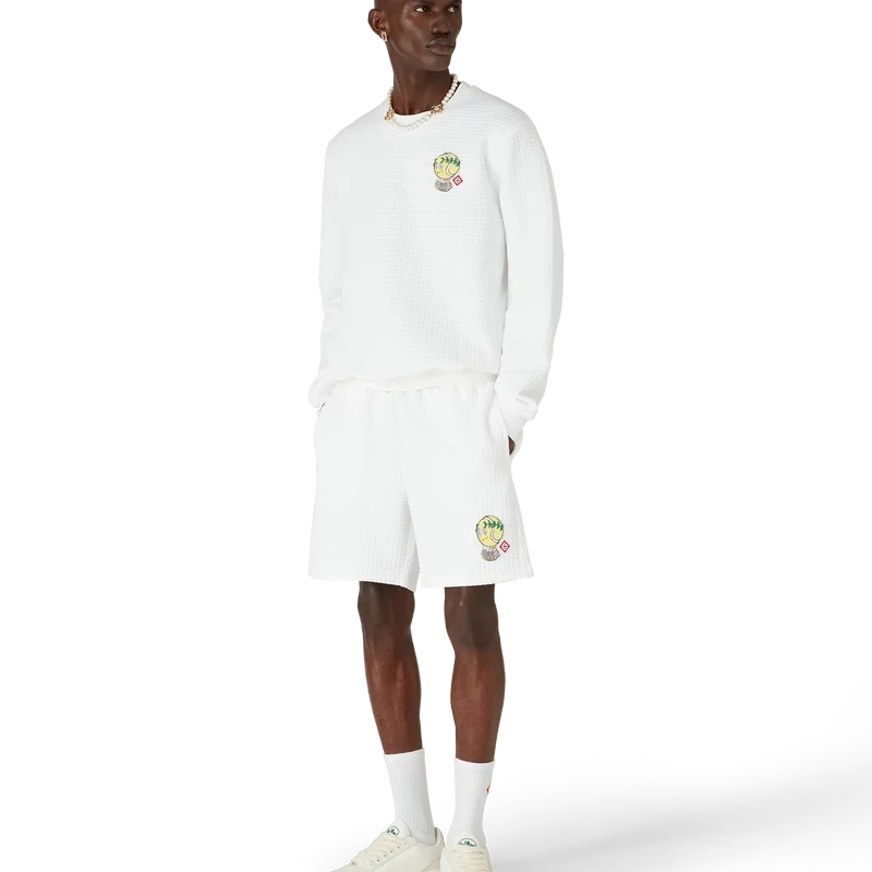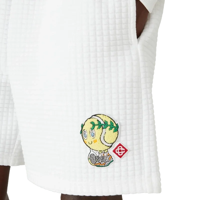De Tennis Mascot gewatteerde sweatshorts hebben een geborduurd ontwerp en zijn gemaakt van een gewatteerde stof met rasterpatroon, voorzien van seizoensgebonden illustraties van de Kawaii-tennisbal – dit personage is een belangrijk onderdeel van ons universum. Het bevat elementen zoals het laurierblad, de Atlantis-sneaker, het racket en de Kawaii-ogen. We hebben ervoor gekozen om dit personage centraal te stellen in alle herenmodellen van de collectie. Afgewerkt met een elastische tailleband, trekkoordsluiting, zakken in de zijnaad en een opgestikte achterzak.