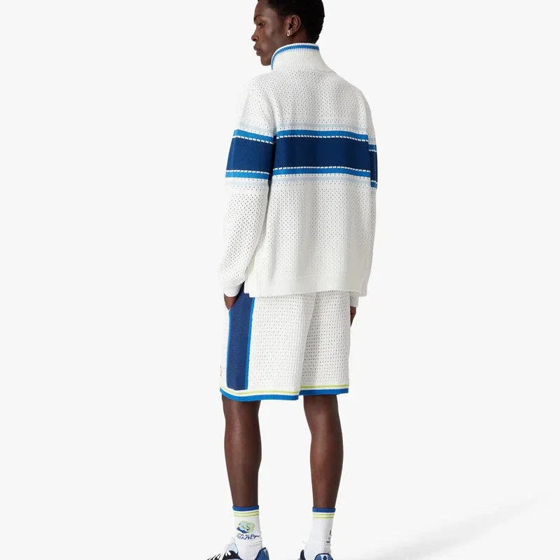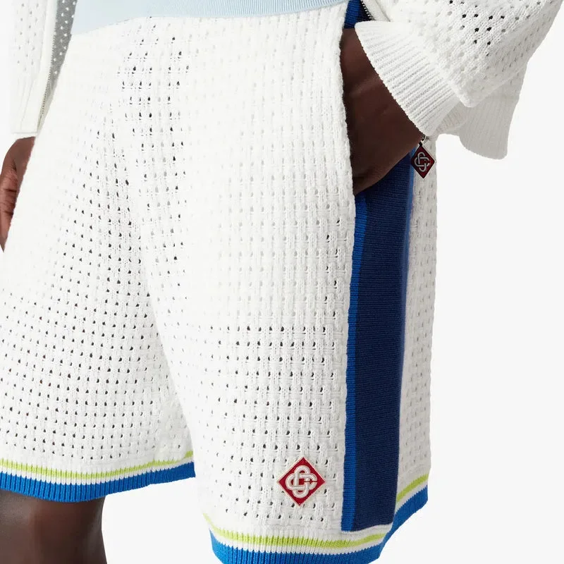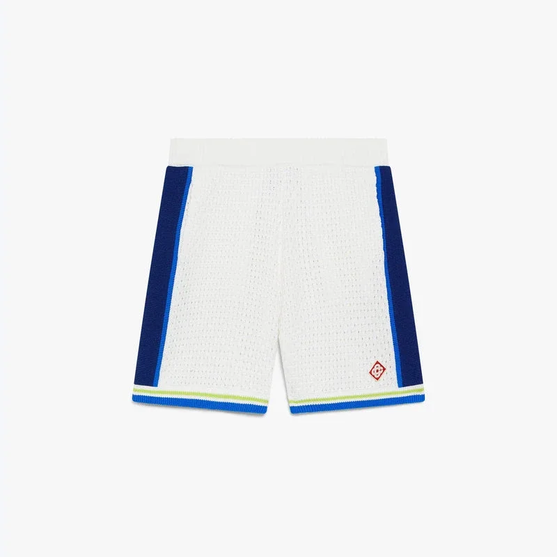 De wit-blauwe gehaakte Short heeft een verfijnd ontwerp en is gemaakt van een open geweven stof met streepjes aan de zijkanten. Afgewerkt met een elastische tailleband, trekkoordsluiting, zijzakken in de naad en gestreepte randen aan de pijpen.
